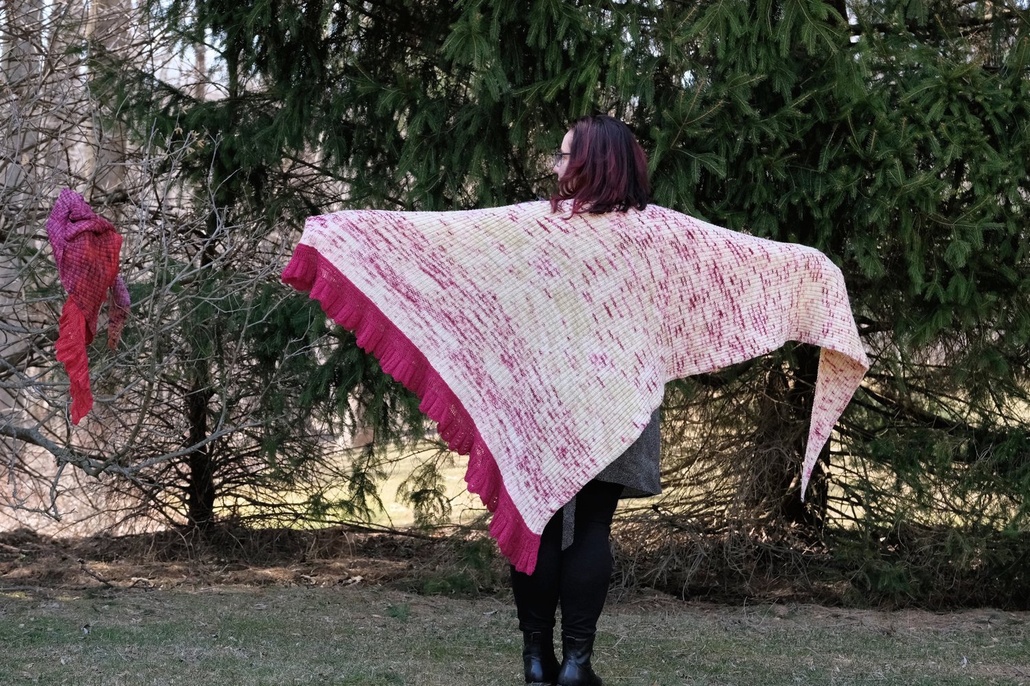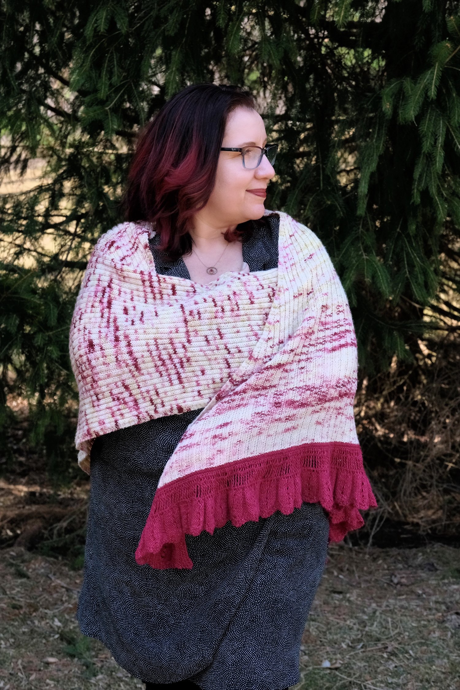 oy is a large shawl. It is a right triangle with a knitted-on lace border. The shawl is knit from the short side of the triangle up to the point. The lace border is added after the knitting of the main shawl is complete. I named the shawl after my dear friend, Joy, who gave me the yarn that inspired the shawl as a birthday gift. Joy would also work well in a solid, semi solid, or even a fade. The pattern is written in two sizes. There is a lot of 2 x 2 rib in the shawl, but the end result is a beautifully draped fabric that is wonderful to wrap up in. The knitted ruffly border adds the perfect amount of softness and femininity to the geometric triangle shape.