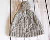 The hat begins with a tubular cast on at the brim, and is worked in a cable and rib pattern to the top, which is rapidly decreased for the S/M version and decreased more slowly for the M/L version.