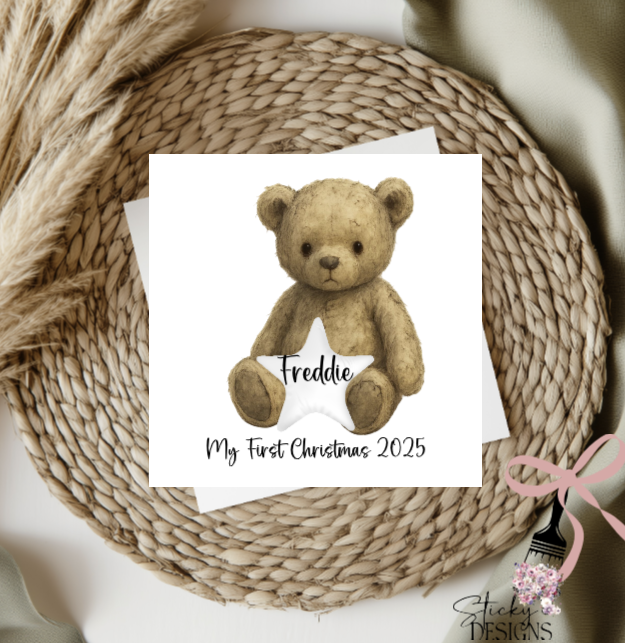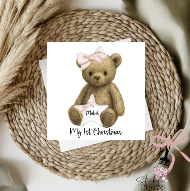 1 design of a really cute teddy bear holding a white cushion, this design can be used for 1st Christmas, Christening, new baby... I have left a couple of examples in the pictures, I did also put these on a large bauble from Woodform Crafts with the 3 cm acrylic bows, using one on the top of the head for a girl and as a bow tie for the boy Free sized all ready to personalise, lot's of scope from cards to cushions