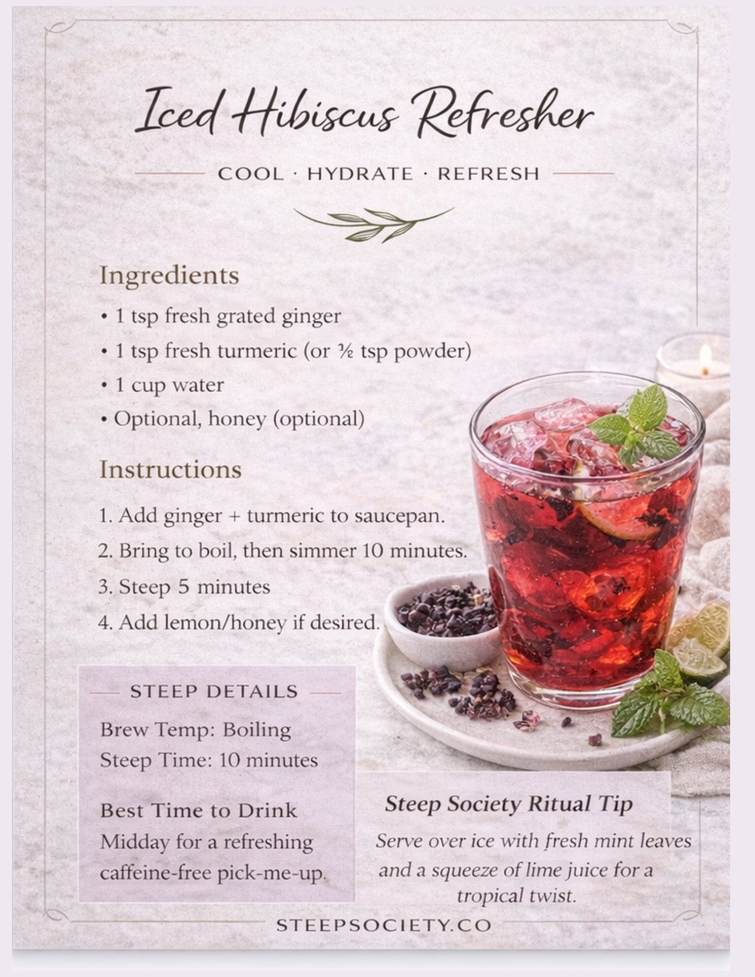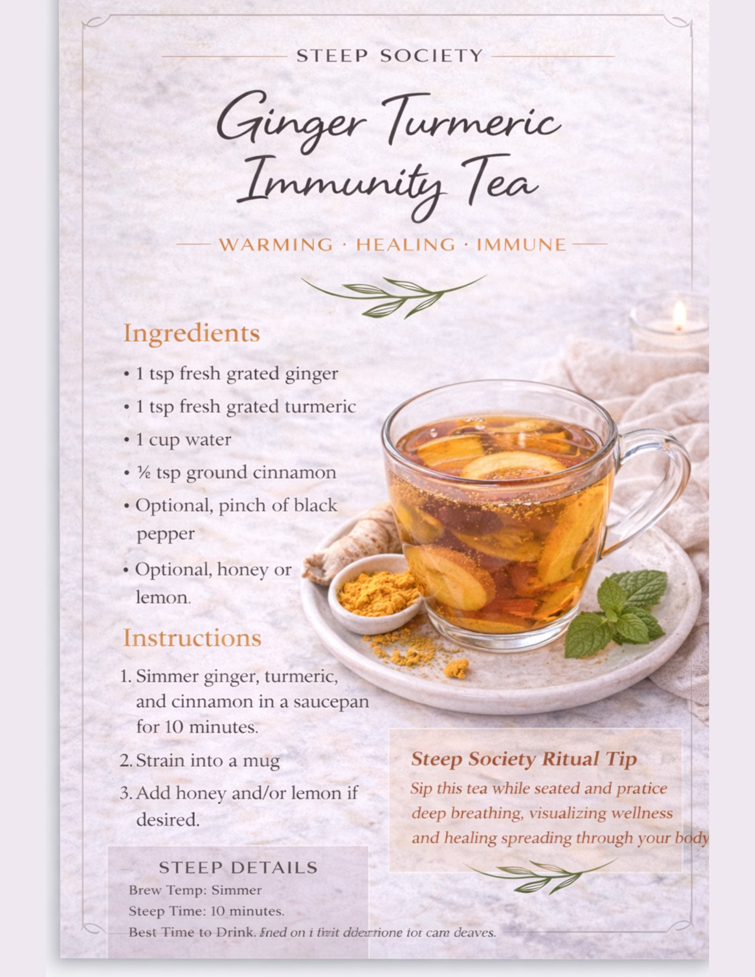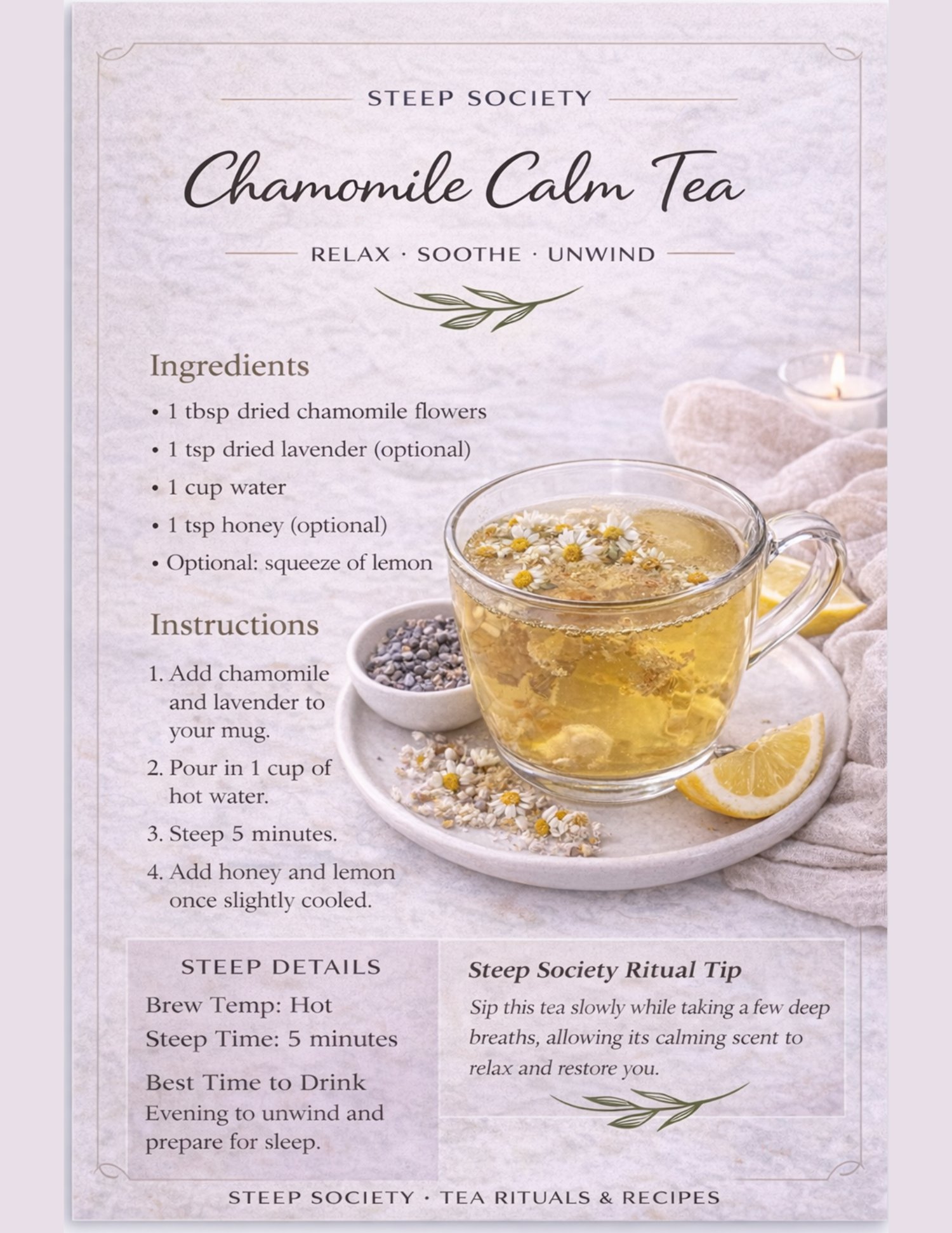 Each recipe includes clear ingredients, step-by-step instructions, steep details, and a Steep Society Ritual Tip to help you turn an ordinary cup into a mindful moment.