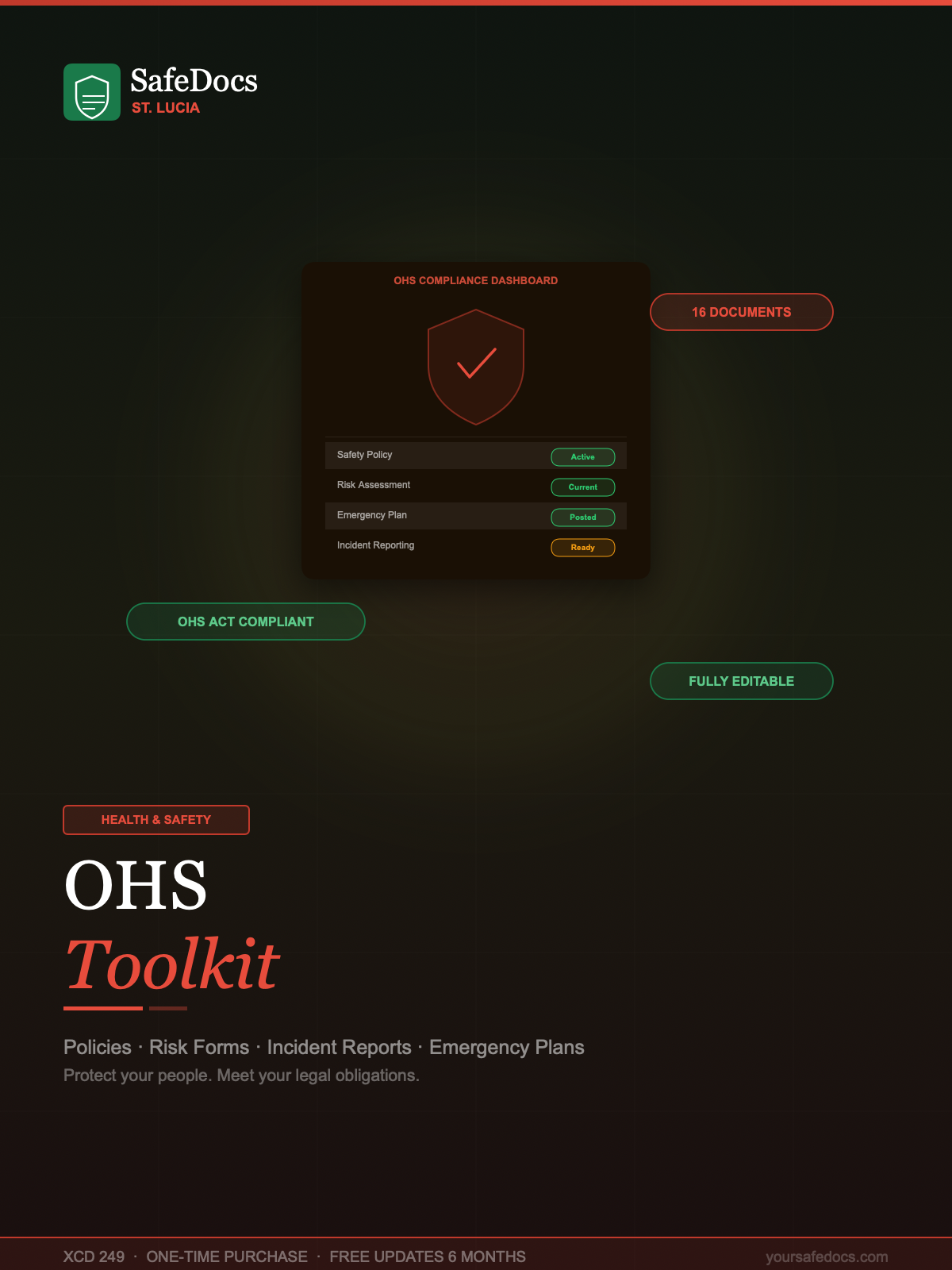 Built specifically for St. Lucia businesses. The risk assessment framework references the OHS Act. The Emergency Response Plan includes hurricane preparation procedures relevant to our Caribbean environment. The incident reporting guidance reflects Labour Department notification requirements.