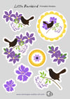 Customise your items with these unique bird-art printable stickers and bring a touch of nature to everyday things. Each design features a little blackbird framed by purple clematis and delicate foliage—perfect for personalising notebooks, laptop covers or gift wrapping. These nature-inspired stickers make a subtle, elegant statement for bird and nature lovers alike. Add personality to your belongings with this charming, high-quality printable artwork. #stickers #stationery