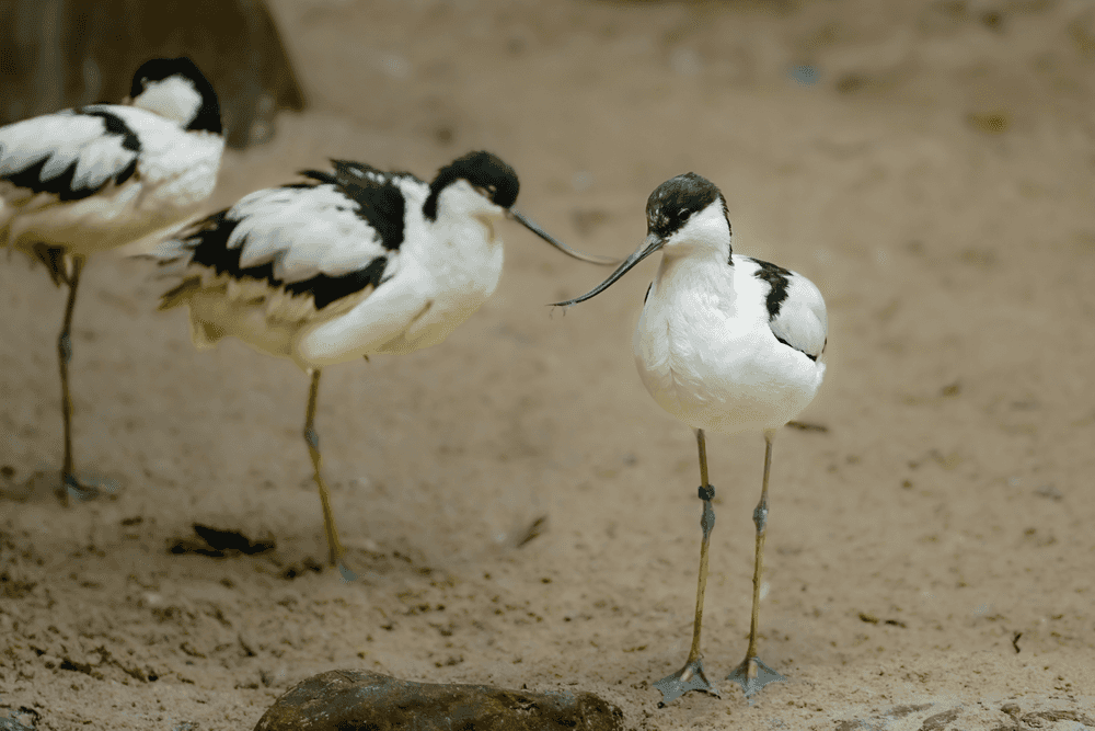 Breng de rust van de waterkant in uw projecten met deze prachtige kluut vogel foto download. De opname toont een groepje kluten in hun natuurlijke habitat, foeragerend langs de zandige waterkant.