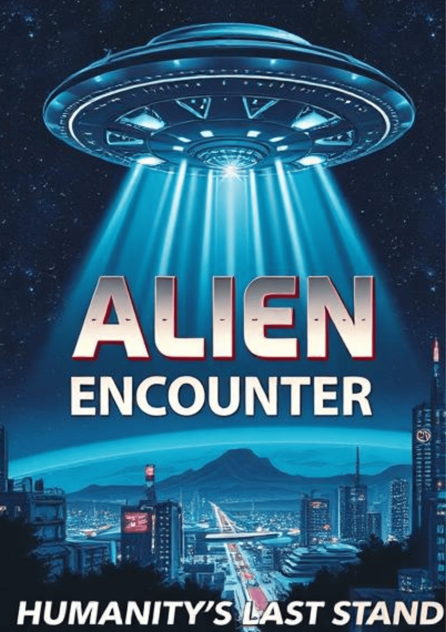 This 1950s retro-style sci-fi movie poster showcases a towering alien spaceship hovering over Earth, beaming down lights that illuminate a futuristic city. With glowing neon colors and dramatic details, this poster will bring an eerie, yet captivating vibe to any room. Whether you're a fan of vintage alien lore or just love retro designs, this is a must-have for your collection.