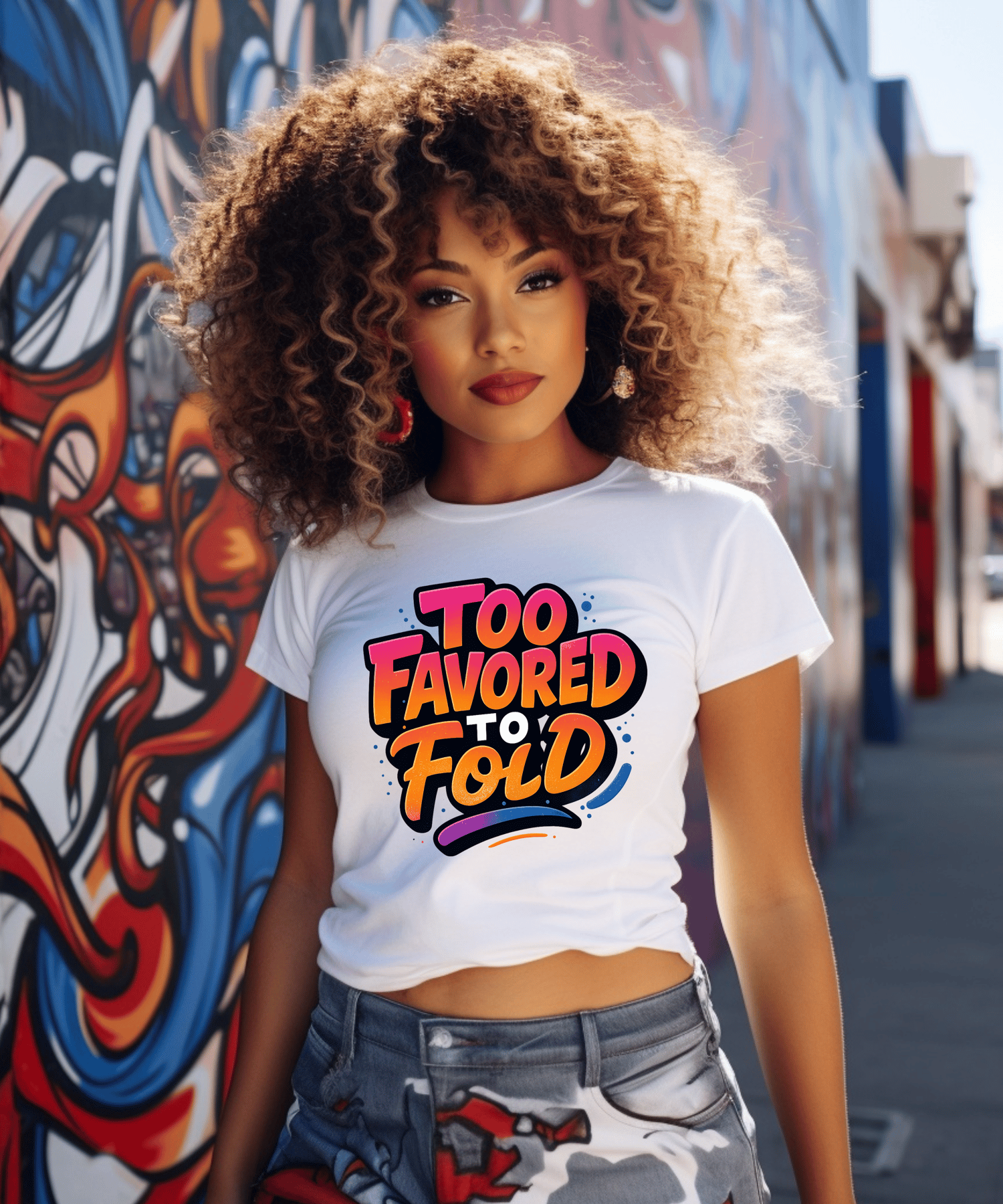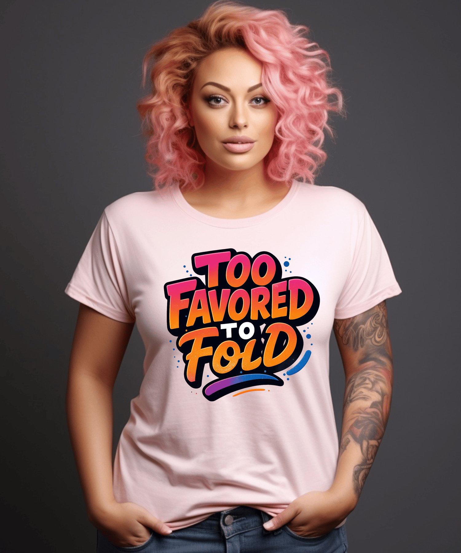 Bold faith meets vibrant style in this “Too Favored to Fold” digital design. Featuring an energizing orange-to-pink gradient with dynamic pops of blue and purple, this statement piece is perfect for apparel, tumblers, journals, and more.