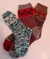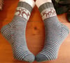A top-down sock knit mostly in stockinette except for one colourwork panel at the top of the leg, this pattern will introduce you to the ladderback jacquard technique (photo tutorial included). The plain portions may be knit using helical stripes (links to video tutorials included). Charts for both dog and cat patterns are included.