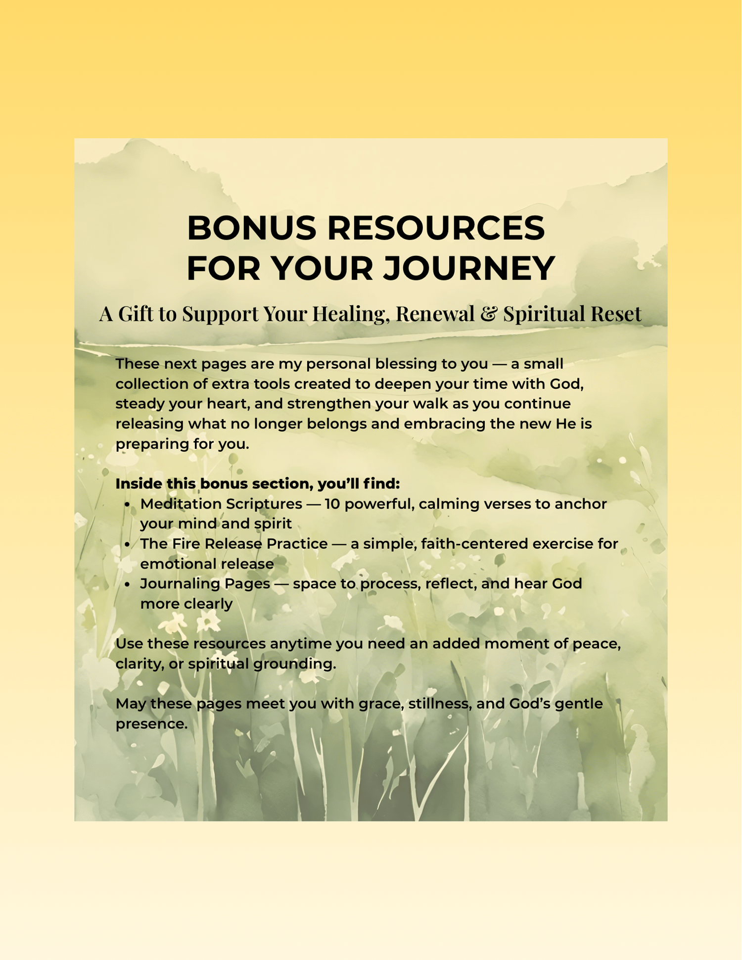 You get a complete spiritual toolkit — meditations, Scripture, guided release, and journaling — to transform your emotional and spiritual life.