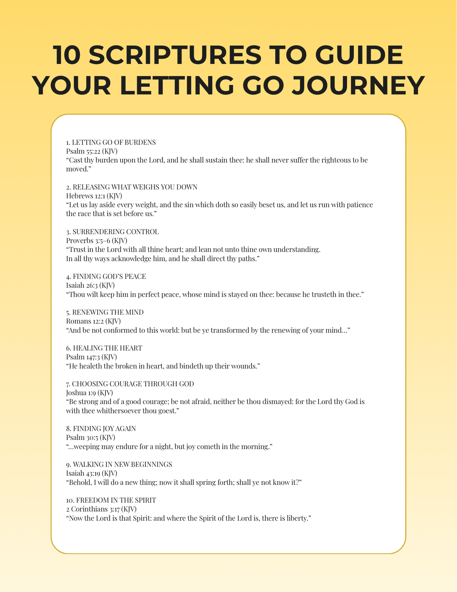 - Let go of regrets, old pain, and emotional weight with God leading the release.