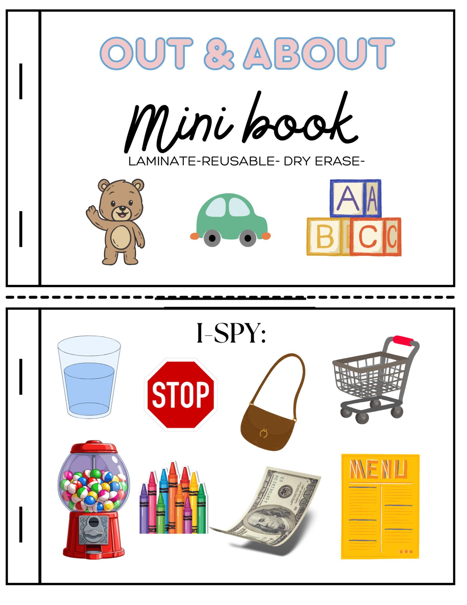 Out & About Dry Erase Mini Workbook-Printable Travel Activity Book for Kids (Restaurants, Car rides, Church, Appointments, Events)