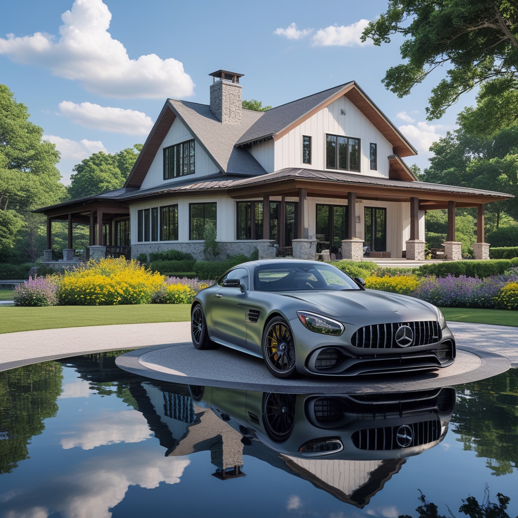 A luxurious, modern lake house with large windows, a sloping roof, and a wraparound porch, surrounded by lush greenery and vibrant flowers, with a stunning grey and black Mercedes Benz GTR AMG coupe parked prominently in the circular driveway at the front of the house, its sleek design and bold lines reflected in the calm, crystal-clear lake water, on a warm, sunny day with a few puffy white clouds scattered across a bright blue sky, with the house's exterior walls painted a soft, creamy white and accented with dark wood trim and subtle stone features, and the lush foliage and vibrant flowers in shades of green, yellow, and purple, perfectly capturing the serene and idyllic atmosphere of the lakeside retreat.