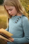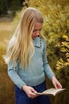 Notes: Children’s Creekside is a fun and easy raglan sweater, knit from the top down with fun lace around the bottom edge and lace details on the sleeves and neck. Instructions are included for both the turtleneck version or a standard crew neck version.