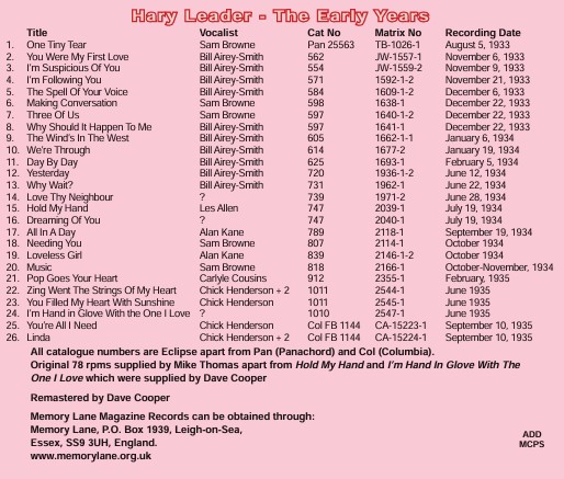 Harry Leader made many recording for the Eclipse label, which preceded the Crown label produced for the F W Woolworth stores. These 8 inch records sold well due to their lower price against the major labels such as His Master's Voice and Columbia. The recordings are slightly shorter than the standard 10 inch record and so we present no less than 26 titles here. They feature top singers like Chick Henderson, Sam Browne and Les Allen.