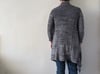 A gorgeous, extra long cardigan with a cosy double moss stitch shawl front and an intricate cabled design. Slipped, twisted stitches in the cables are designed to look great in handdyed yarn. It’s a top down, totally seamless cardigan with ¾ length sleeves. Both written instructions and charts are given for all the cable patterns, and it has instructions for 8 sizes to fit a 75 – 150 cm/30 – 60” bust.