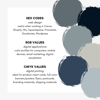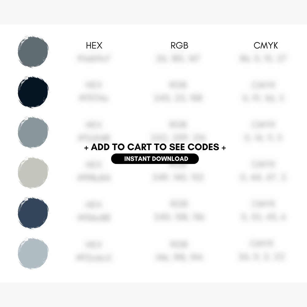 Each color in the palette comes with precise Hex Codes, RGB, and CMYK values, ensuring seamless integration into your website color scheme or any digital project. Embrace the timeless elegance and subtle mystery of these hues to make a lasting impression on your audience. Perfect for those looking to infuse their brand with a touch of class and intrigue. Download now and transform your creative vision into reality with this exceptional palette!