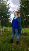 You can wrap it around you, knit a belt to it, fasten with a shawl pin, anything! No waist shaping in the pattern, the shaping comes naturally when you wear this garment!