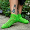 Size: this pattern is written for 4 adult sizes and for 2 lengths: shorter trainer socks, and longer ankle socks. Don’t be afraid to knit a size with more negative ease than you’re accustomed to. The measurements were taken flat, and the socks will stretch as the eyelet pattern opens out greatly on the foot.