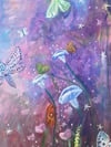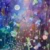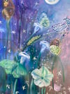 There is something sacred about the night — the moths who navigate by moonlight, the flowers that only open in darkness. "Moths & Moonflowers" was created with acrylic and real selenite crystal, a stone known for its lunar energy and capacity to cleanse and calm. This piece doesn't just hang on a wall — it holds space. For the quiet hours, the tender moments, the parts of you that come alive when the world goes still.
