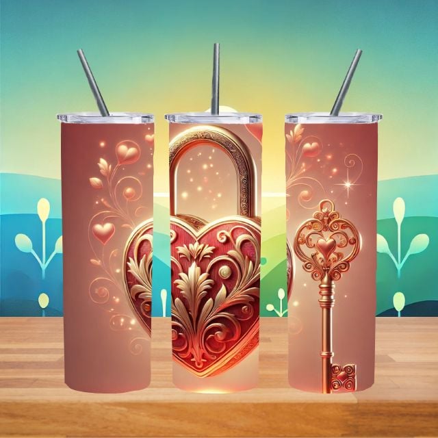 Unlock love and elegance this Valentine’s Day with our enchanting 20oz tumbler featuring a heart-shaped lock and matching ornate key design. With intricate swirls, a glowing gold and red finish, and a soft pink-to-red gradient background accented by floating hearts and sparkles, this tumbler is the perfect symbol of love and connection.