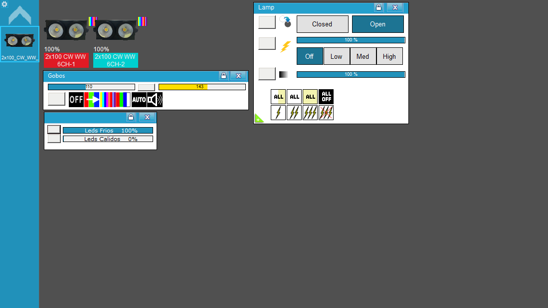 * Verifique, con un Fixture de pruebas (click), que coincidan estos canales 1 Dimmer, 2 Blanco Frío, 3 Blanco Cálido (amarillento), 4 Strobo.