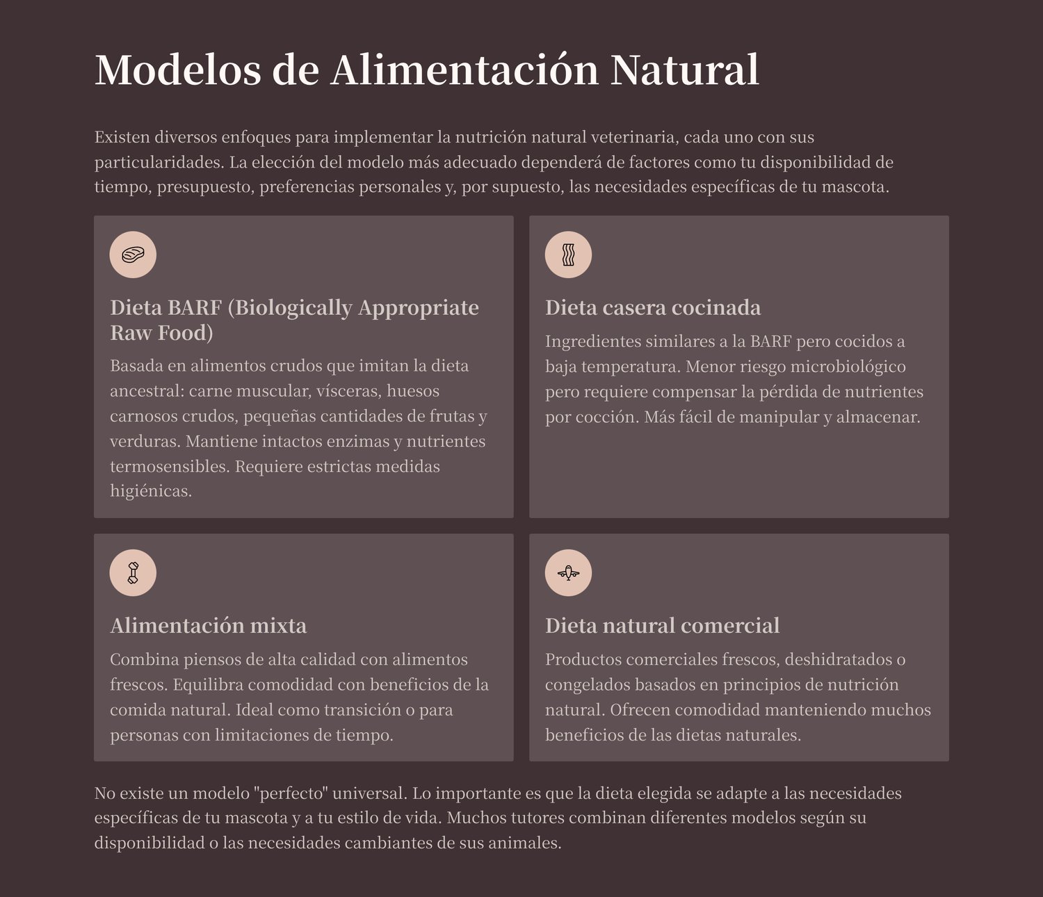 - Opciones de dietas naturales: BARF, cocida natural, mixta y sus características principales.