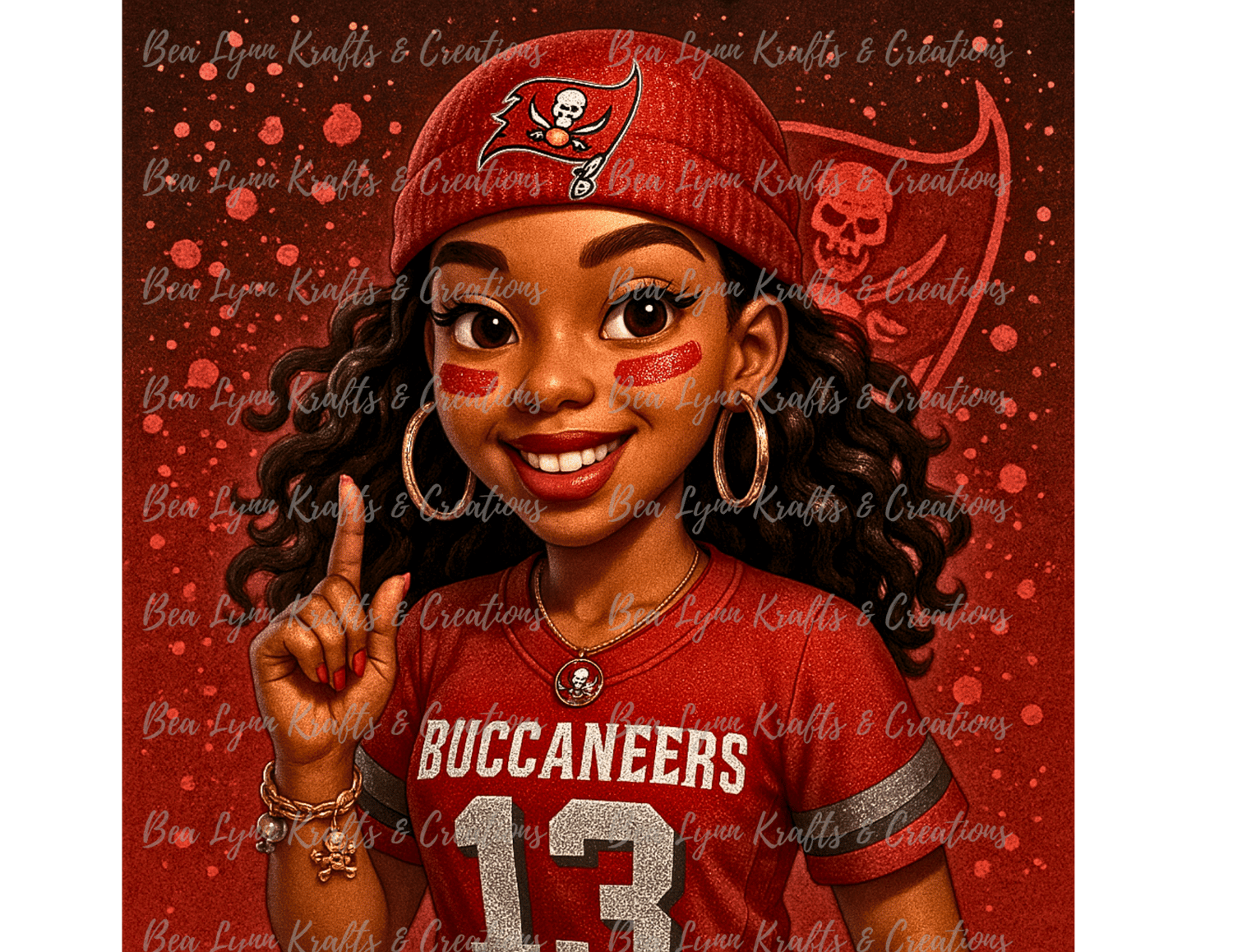 Cheer on the Bucs with style using this vibrant Tampa Bay Buccaneers cartoon PNG! Featuring a smiling young fan in a #13 jersey, red beanie, bold face paint, hoop earrings, and Buccaneers-themed jewelry, this image radiates team pride with charm and confidence. The fun red splash background and sporty pose make it a standout addition to any design. Perfect for game-day products, youth apparel, sublimation crafts, or party décor.