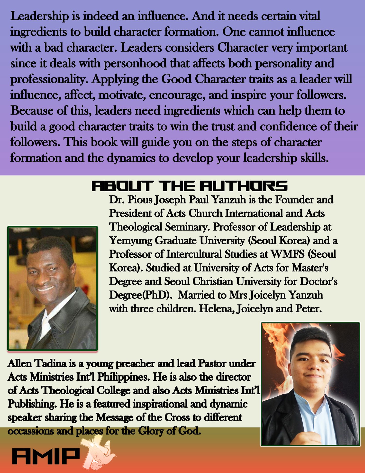 Leadership is indeed an influence. And it needs certain vital ingredients to build character formation. One cannot influence with a bad character. Leaders considers Character very important since it deals with personhood that affects both personality and professionality. Applying the Good Character traits as a leader will influence, affect, motivate, encourage, and inspire your followers. Because of this, leaders need ingredients which can help them to build a good character traits to win the trust and confidence of their followers. This book will guide you on the steps of character formation and the dynamics to develop your leadership skills.