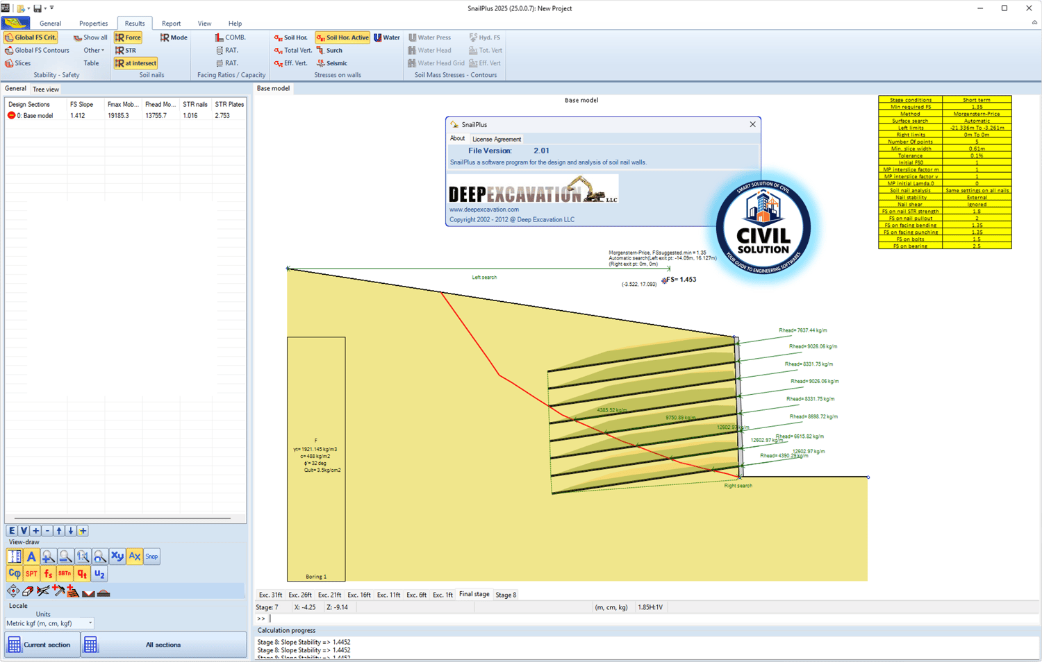 🐚 Deep Excavation SnailPlus 2025 v25.0.0.7 is a specialized software designed for high-precision design and analysis of soil nails and ground anchors in deep excavation projects. It integrates advanced limit equilibrium and finite element methods to evaluate soil nail system stability, accounting for load transfer, pullout resistance, and interaction effects. The software supports comprehensive modeling of soil nail walls, anchored retaining walls, and complex multi-stage construction sequences for geotechnical safety and performance optimization.