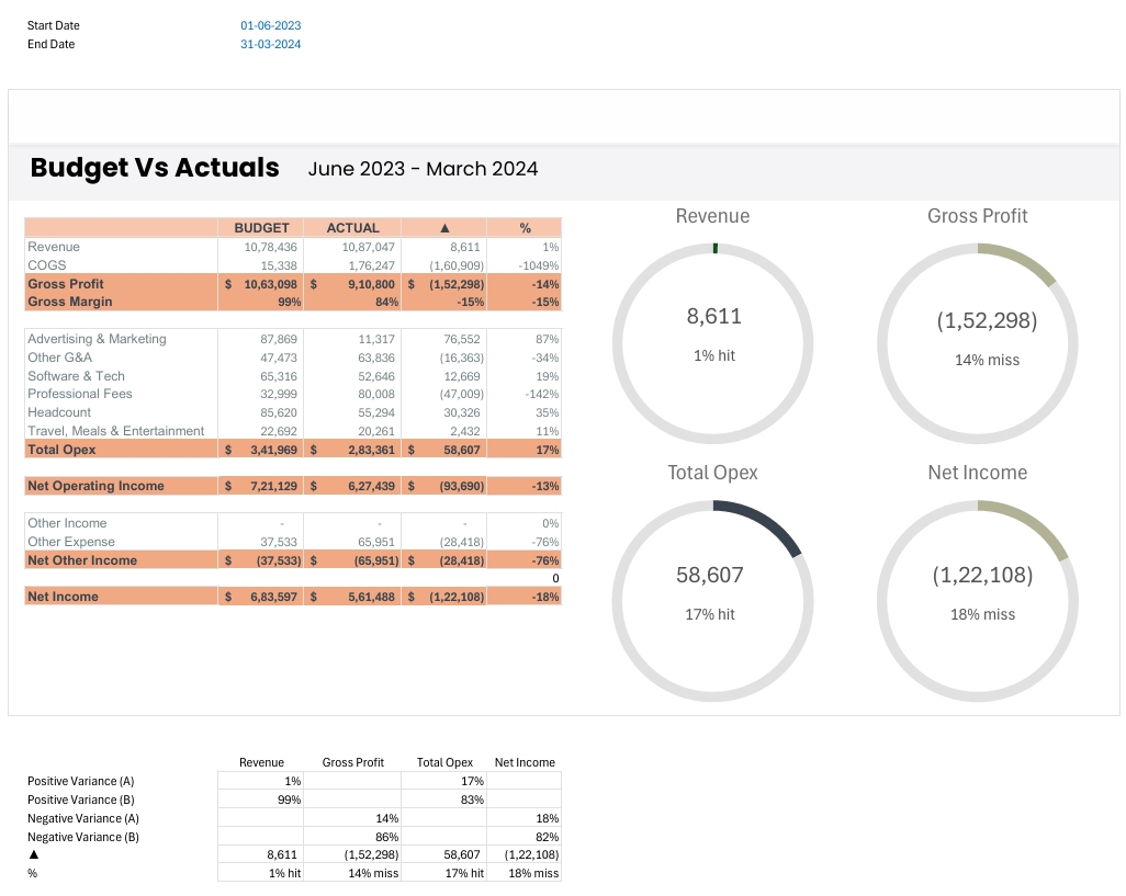 - Comprehensive Variance Analysis: Instantly see where your business is over or under budget for revenue, gross profit, expenses, and net income.