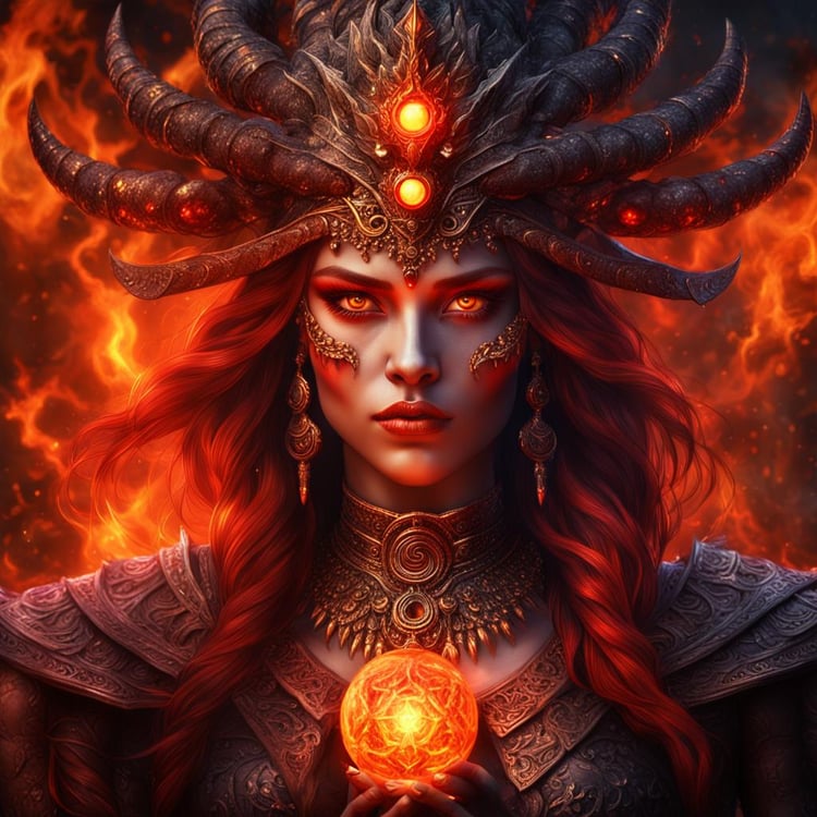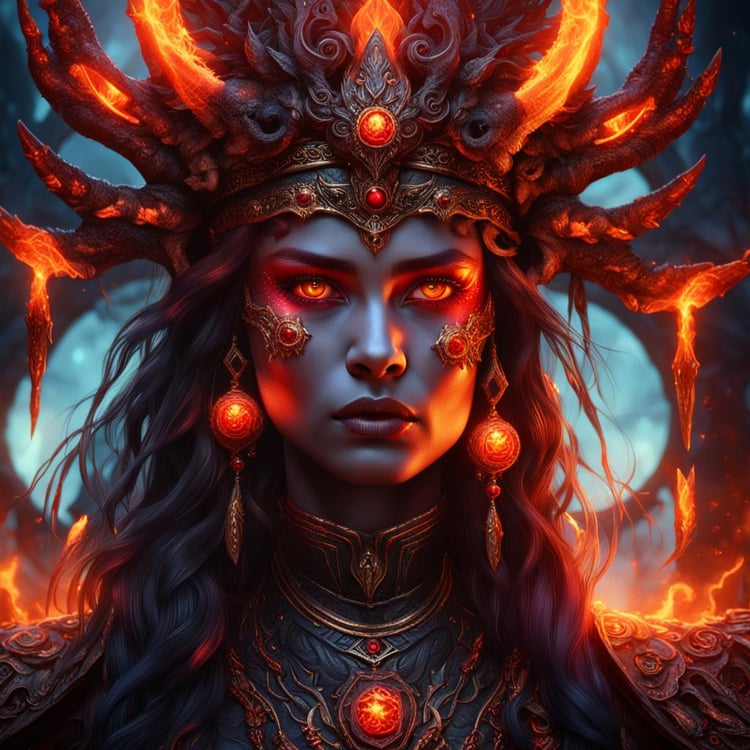 Product Description: Unleash the fiery power of the "Majestic Fire Sorceress Queen," a photorealistic digital portrait capturing the intense gaze and commanding presence of a sorceress queen in the Inferno Temple. With glowing red eyes and regal attire, she exudes majesty and raw power.