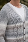 Em seguida, levantamos malhas nas laterais dessas peças e montamos malhas para formar o decote das costas. Tricotamos as costas até à altura da cava e deixamos em espera. Tricotamos em seguida cada uma das frentes, também a partir de malhas levantadas no ombro, formando o decote com aumentos e tricotando o gráfico do ponto de torcidos. Na cava, unimos todas as peças e tricotamos o corpo do casaco. As mangas são tricotadas de cima para baixo, a partir das malhas levantadas em redor da cava e formando a cabeça da manga com carreiras encurtadas. O ponto de torcidos está descrito em gráficos.