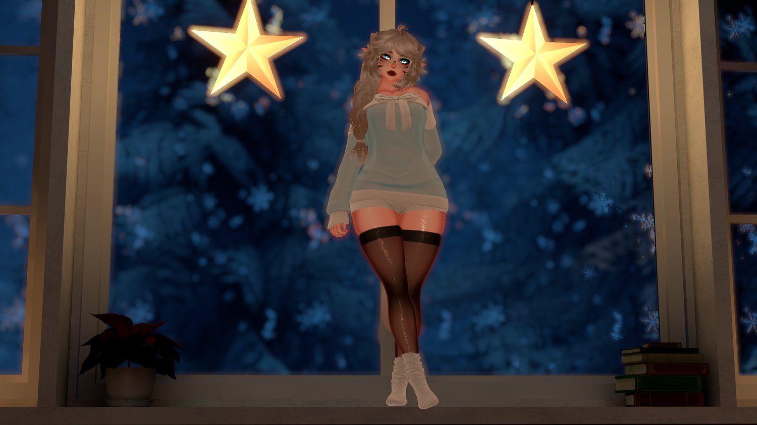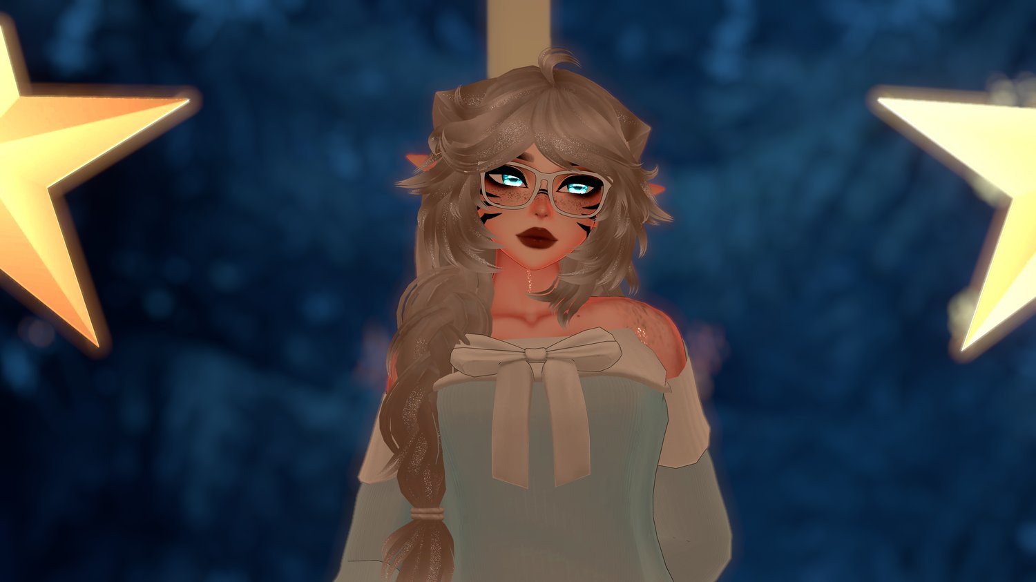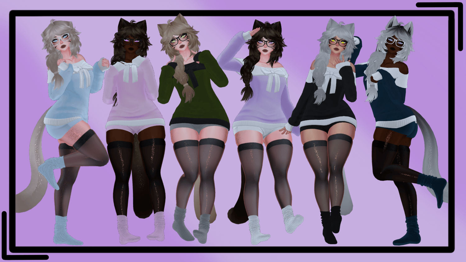 | Body by Pandaabear#9873 (EDITED BY ME, NO REUSE) | Head/Head Textures by DUCC#0008 (EDITED BY ME, NO REUSE) | Hair Textures by Cicieaaa#7777 | Fluff's ToolBox | VRCFury Tool | GoGoLoco by Franada | Hair by Minki | Sweater by Skeletib | Shorts by Skeletib | Thigh Highs by Whituu | Socks by Zammy3d | Glasses by Salted |
