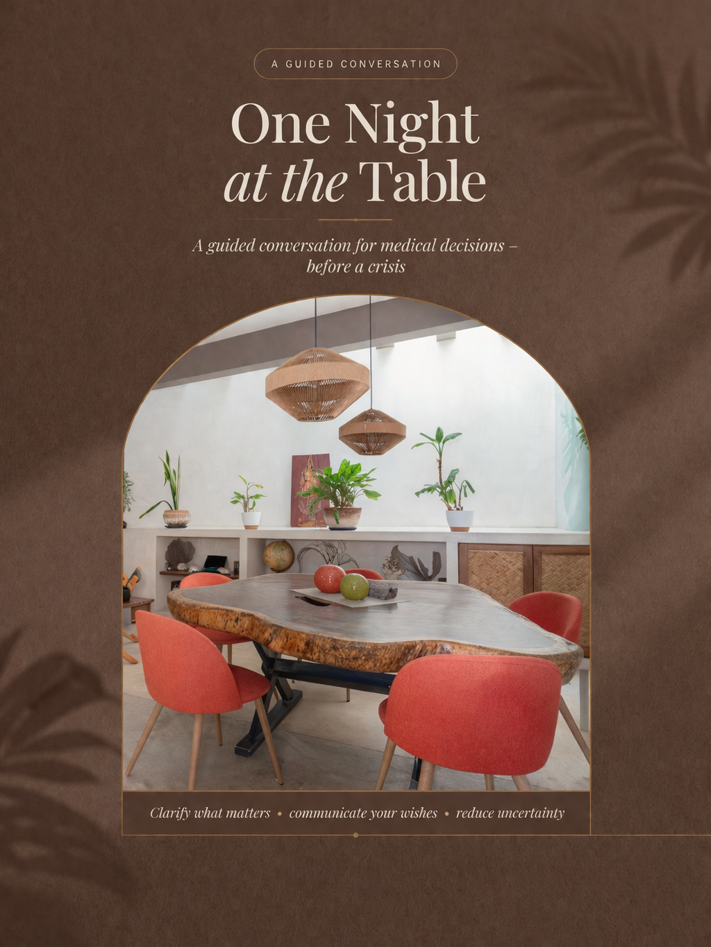 A guided, one-evening experience designed to help you start a clear, grounded conversation about medical wishes — before a crisis forces it.
