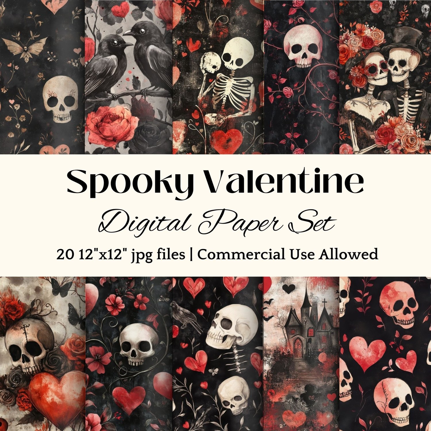 Looking for a dark and eerie twist on Valentine’s Day? This Spooky Valentine Digital Paper Pack is perfect for creating gothic romance designs, horror valentines, and alternative love-themed crafts. Featuring 20 high-resolution 12” x 12” JPG backgrounds, this collection blends haunted aesthetics with romantic gothic elements, including skeleton lovers, vampire hearts, ghostly florals, and creepy cute patterns.