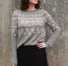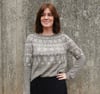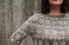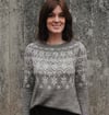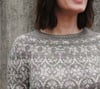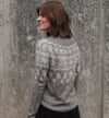This garment is worked top-down, in the round. After the neckband, short row shaping is incorporated to optimise fit. The majority of the yoke features a stranded colourwork pattern. Once the yoke is completed, stitches are separated into body and sleeves, which are each worked separately and in the round. The colourwork pattern continues in the upper part of the body and sleeves, after which each are worked in stockinette and finished with a half-twisted rib edging.