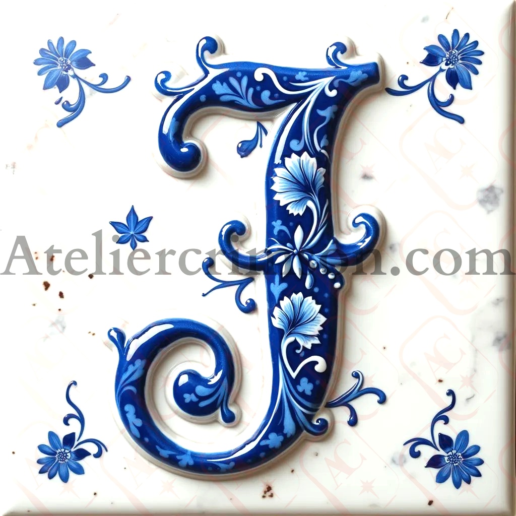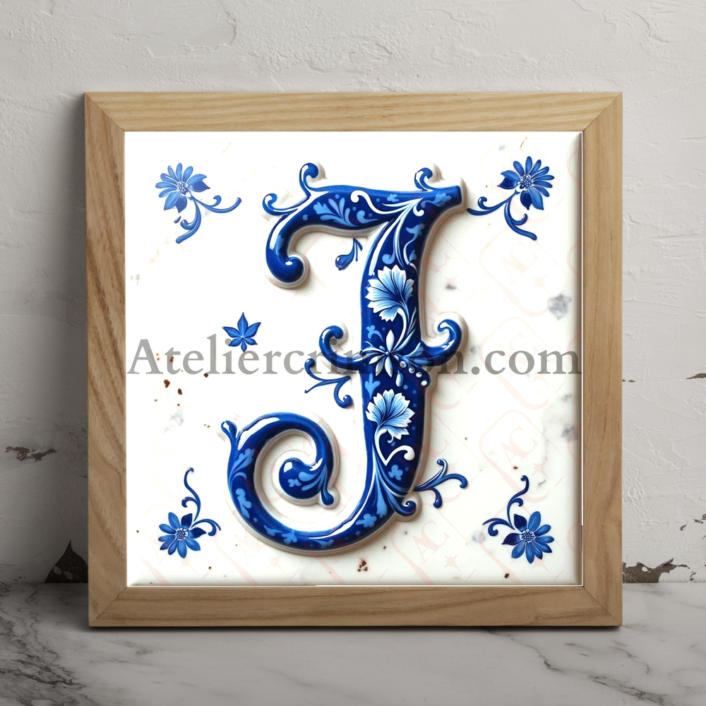The letter J delftware blue tiles Download Now this high quality AI-generated image, perfect for adding a touch of tranquility and creativity to any space.
