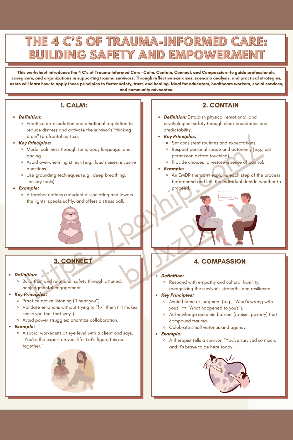 This worksheet introduces the 4 C’s of Trauma-Informed Care—Calm, Contain, Connect, and Compassion—to guide professionals, caregivers, and organizations in supporting trauma survivors. Through reflective exercises, scenario analysis, and practical strategies, users will learn how to apply these principles to foster safety, trust, and healing. Ideal for educators, healthcare workers, social services, and community advocates.