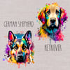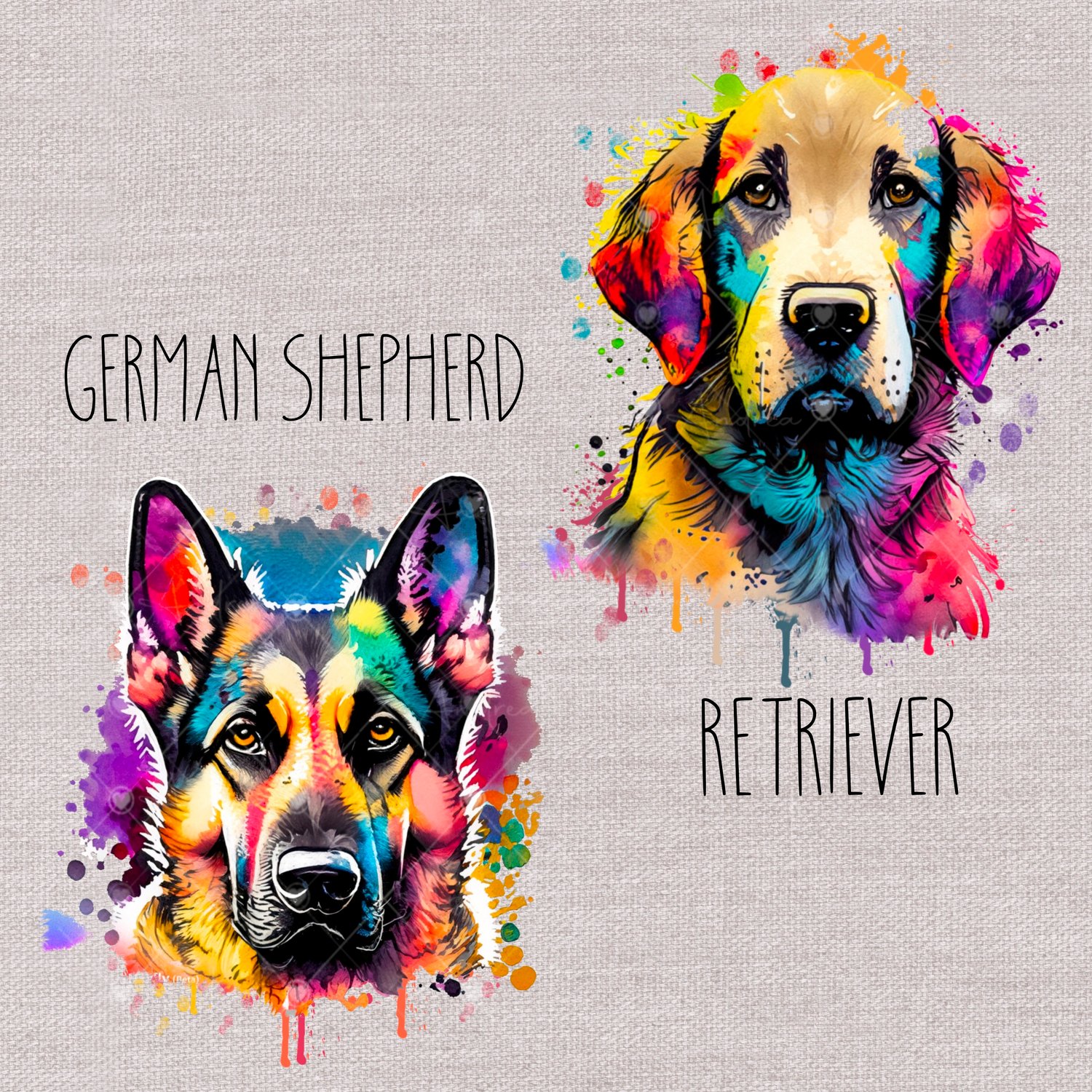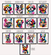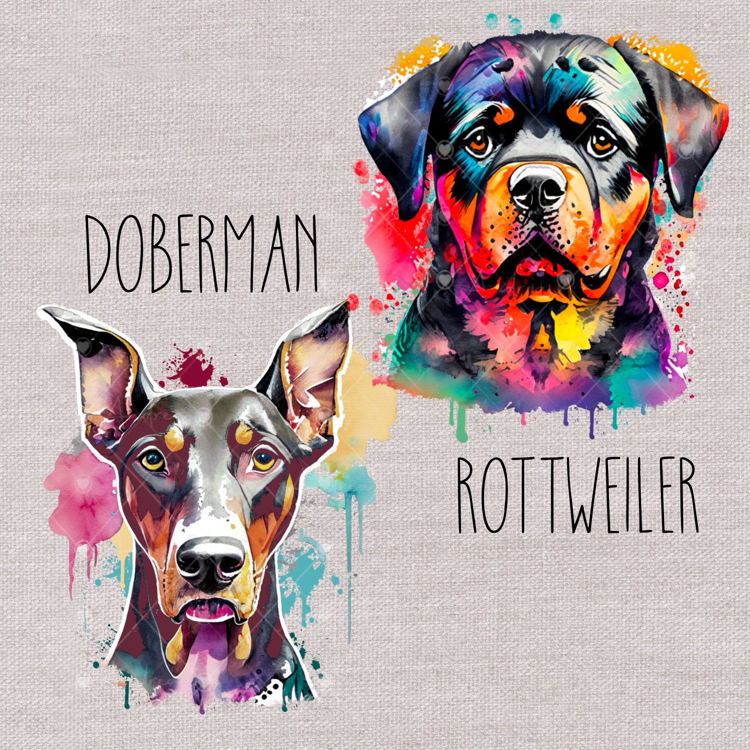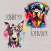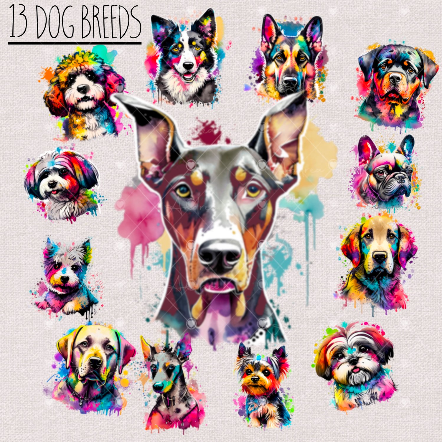 Graffiti art dogs, 13 breeds. Cockapoo/Cavapoo, Yorkshire Terrier, Shih Tzu, French Bulldog, Lurcher, West Highland Terrier, Maltese. Large dogs, 6 breeds; Collie, Rottweiler, Doberman, Retriever, Shepherd, Labrador