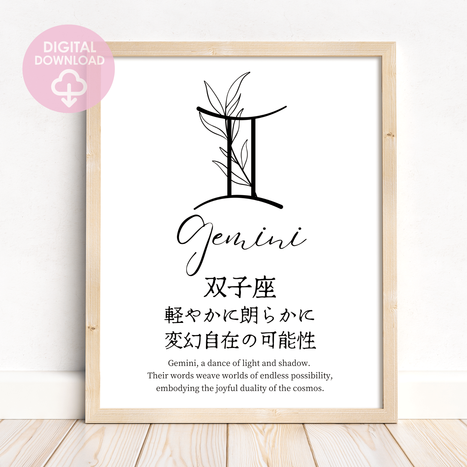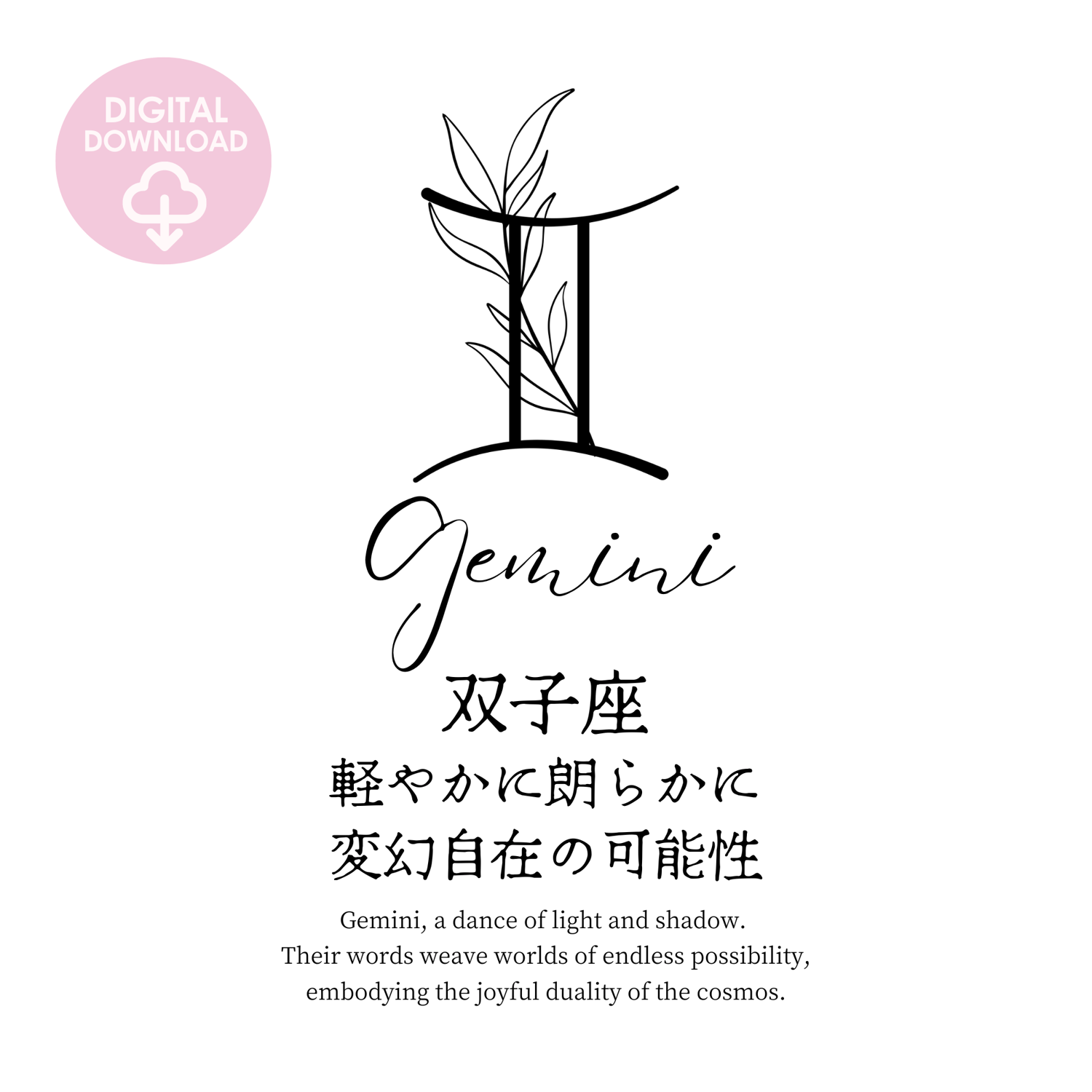 Embrace the Gemini vibe with this modern black and white printable art that beautifully juxtaposes English and Japanese quotes about Gemini’s vibrant traits. Its simple yet striking design makes it a standout piece.