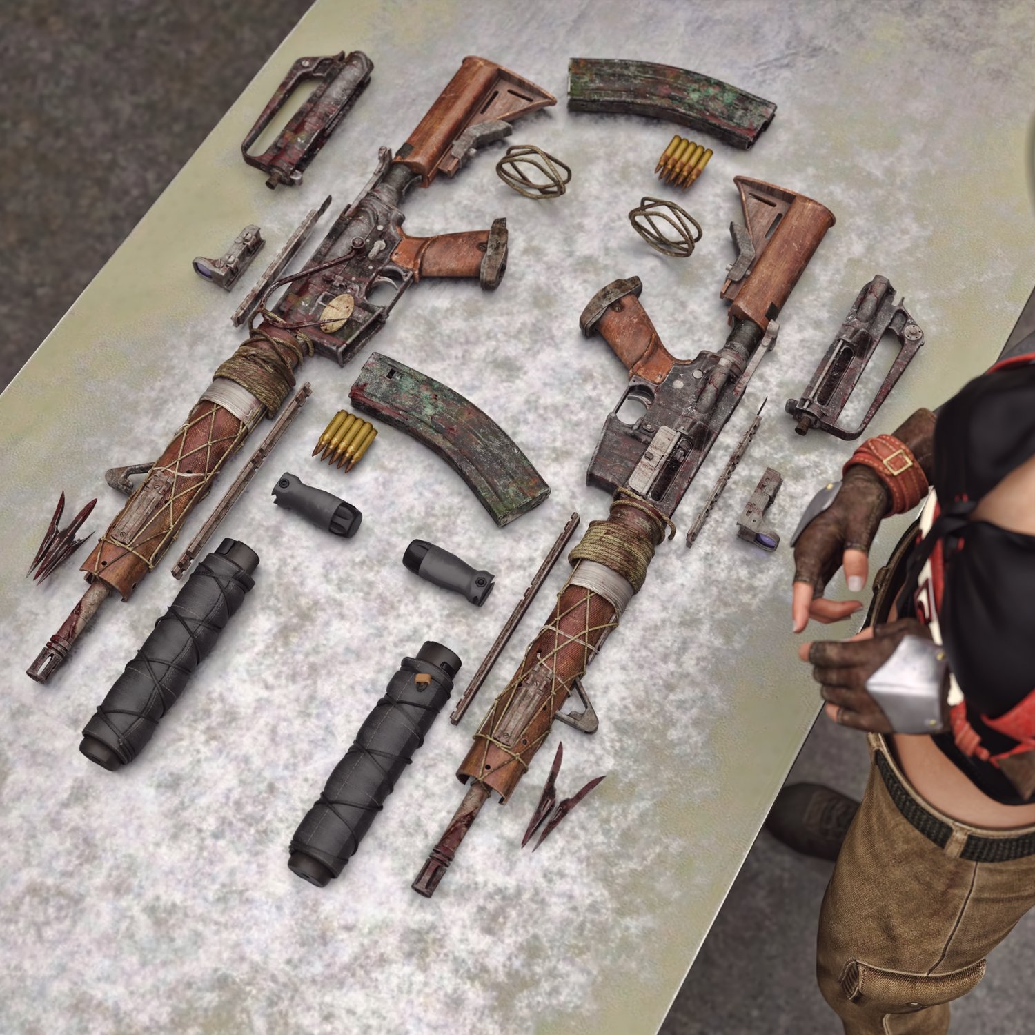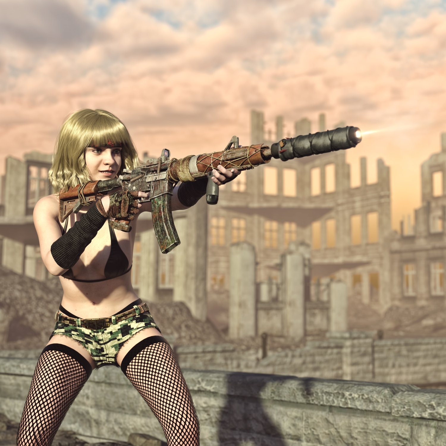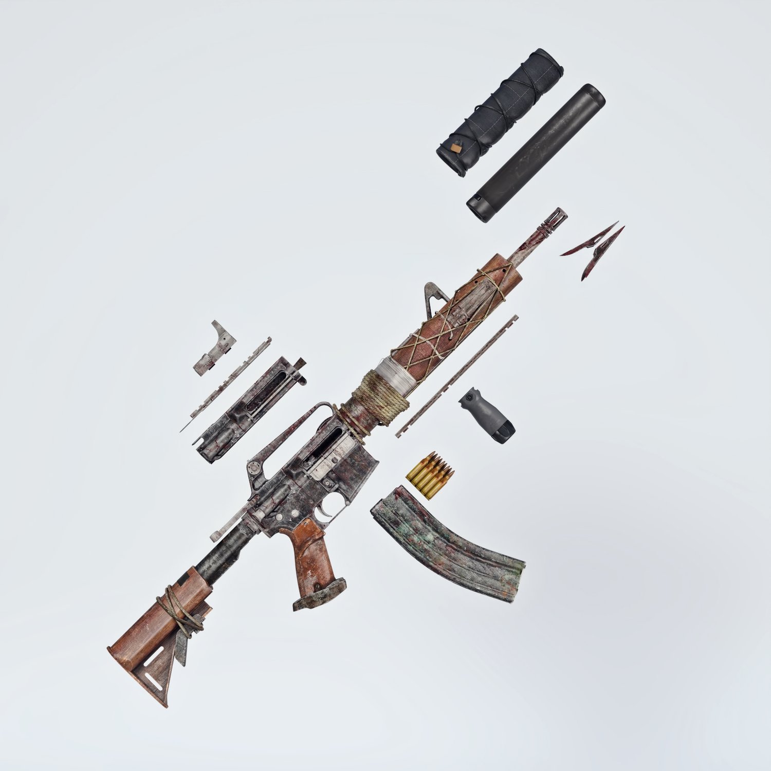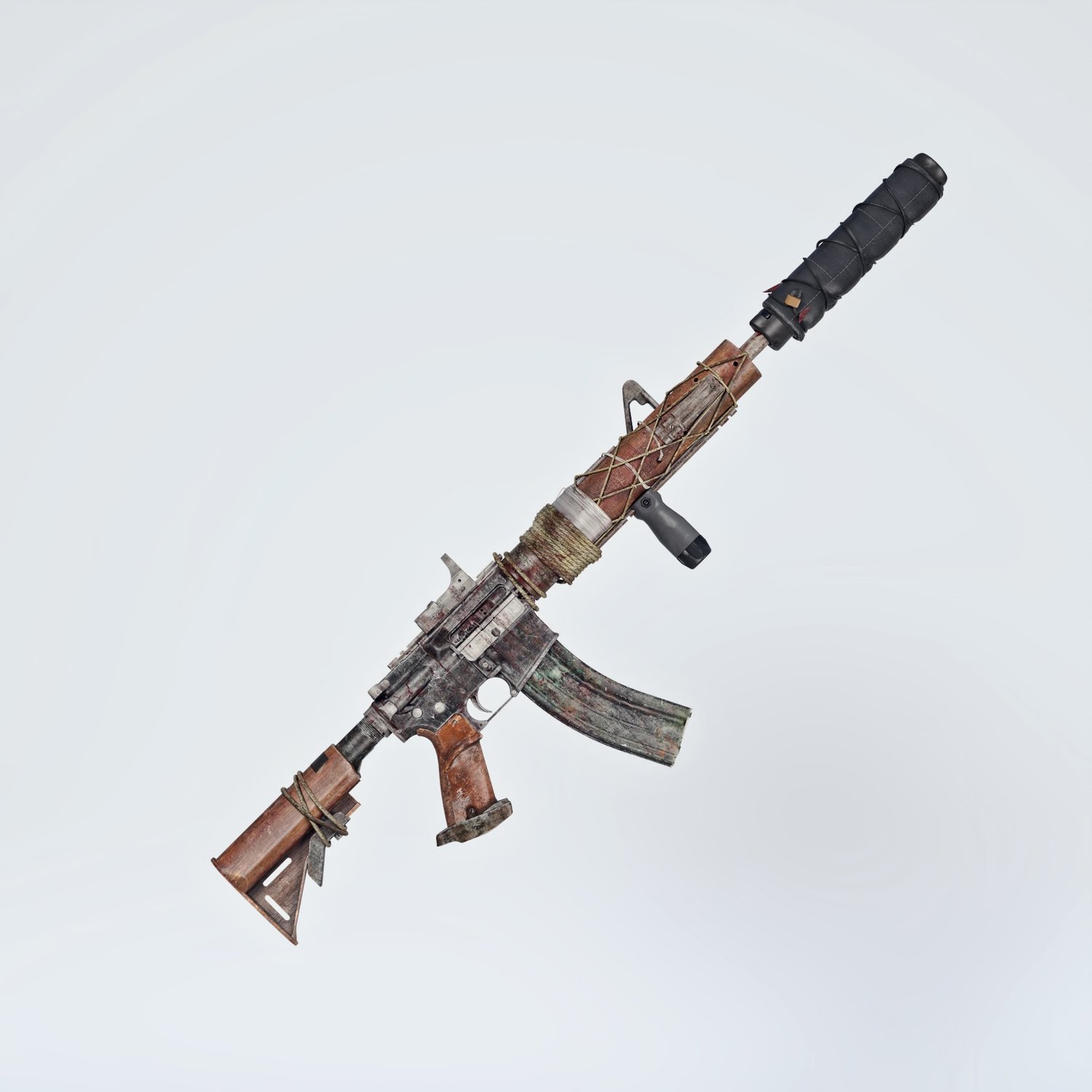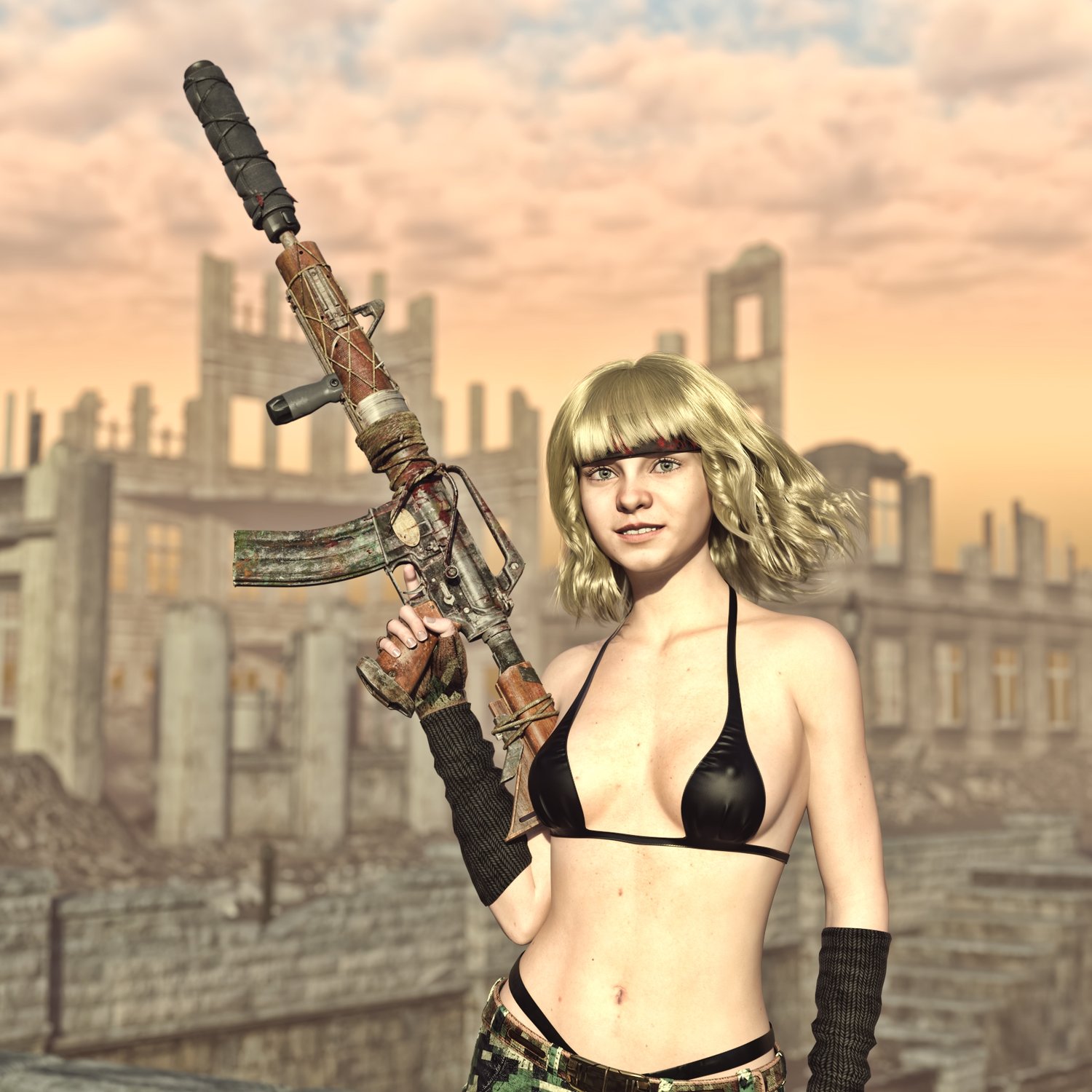 A postapocalyptic variant of the legendary M16 rifle, rigged and converted for use with DAZ. Originally developed in the 50s and 60s, it will probably serve long into post apocalyptic era‥ Trigger, safety, bolt, stock, etc also rigged for more realistic pictures. Includes some accessories to spice up your gun- 2 kinds of upper (flat top and regular), a red dot sight, front grip, silencer with and optional cover and a sharp front tip, so your options are vast.