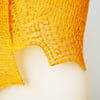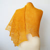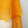 Kurkuma is a shallow, triangle scarf, knit sideways. This design features lace patterning in the tradition of the Shetland isles. The triangle edging is worked at the same time as the body of the shawlette. Worked at a loose gauge, Kurkuma is a lovely and airy layering piece.