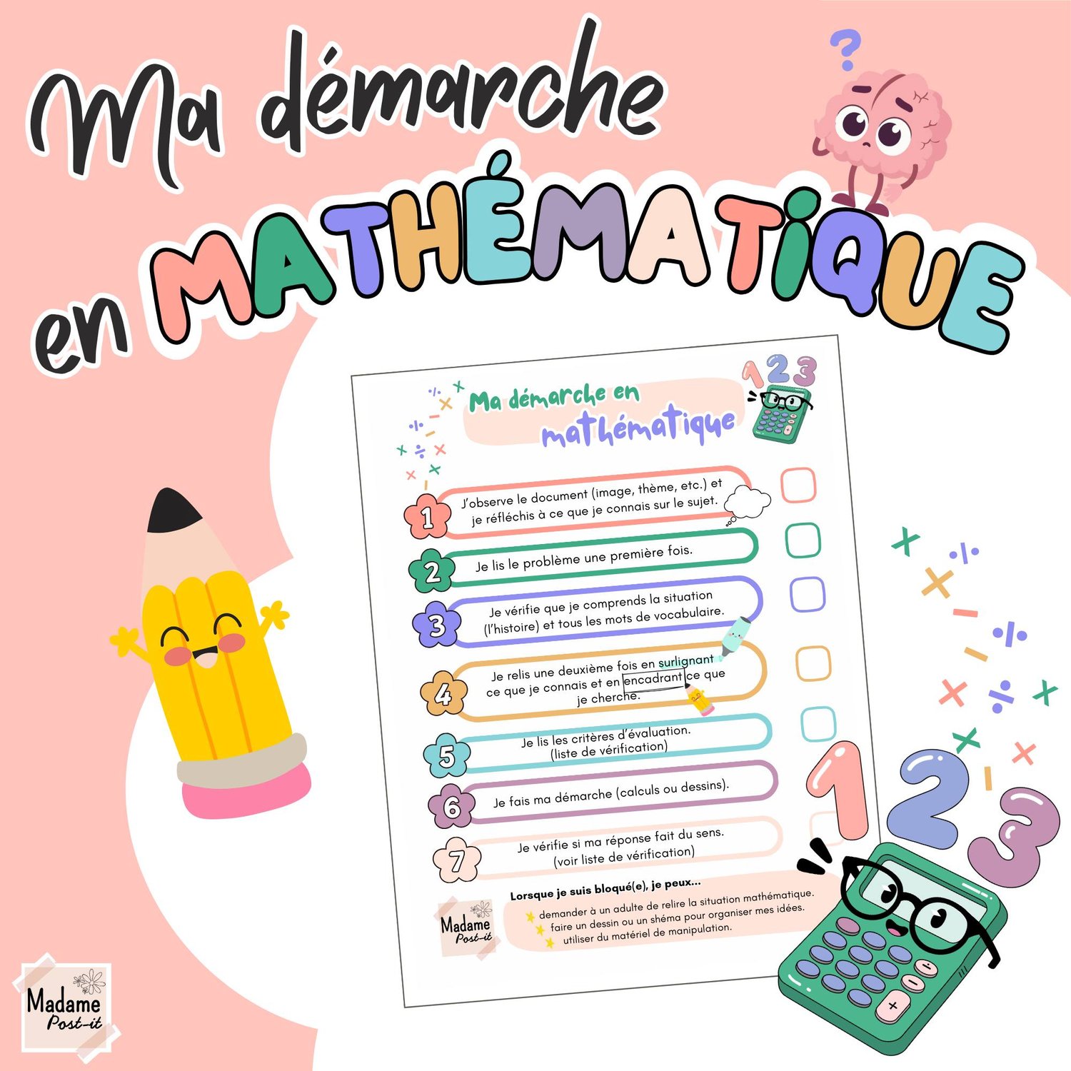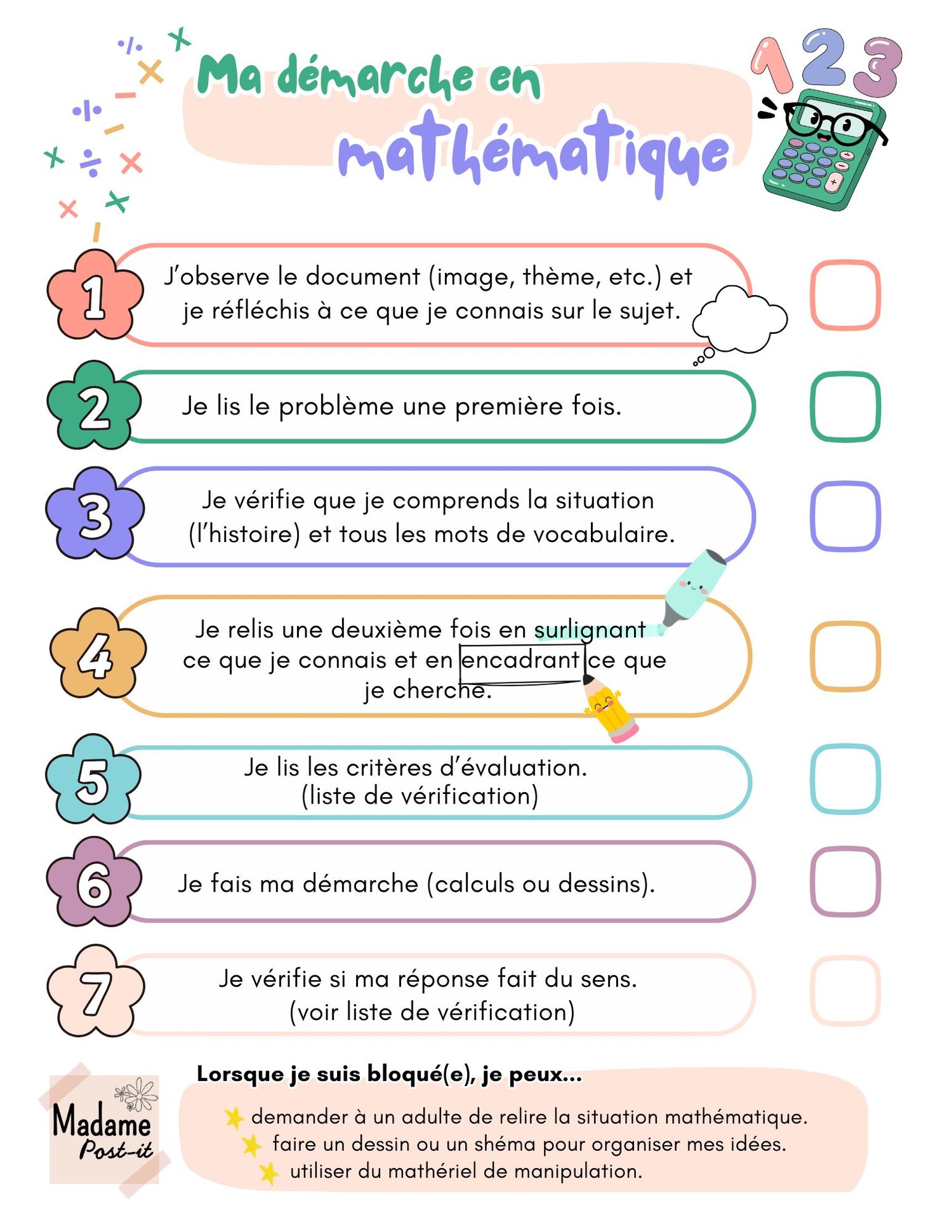 Outil pour les élèves et pour l'enseignant facilitant l'organisation durant une résolution de problème en mathématique. Que ce soit lors d'une modélisation, un Raisonner ou encore un Résoudre, cet outil guidera les élèves en leur rappelant les stratégies en mathématique. Je suggère de demander aux élèves d'insérer la feuille de démarche dans une pochette transparente afin qu'ils puissent cocher encore et encore les étapes de leur démarche.