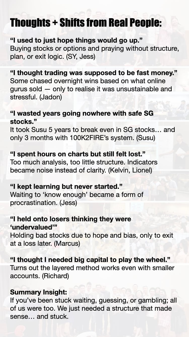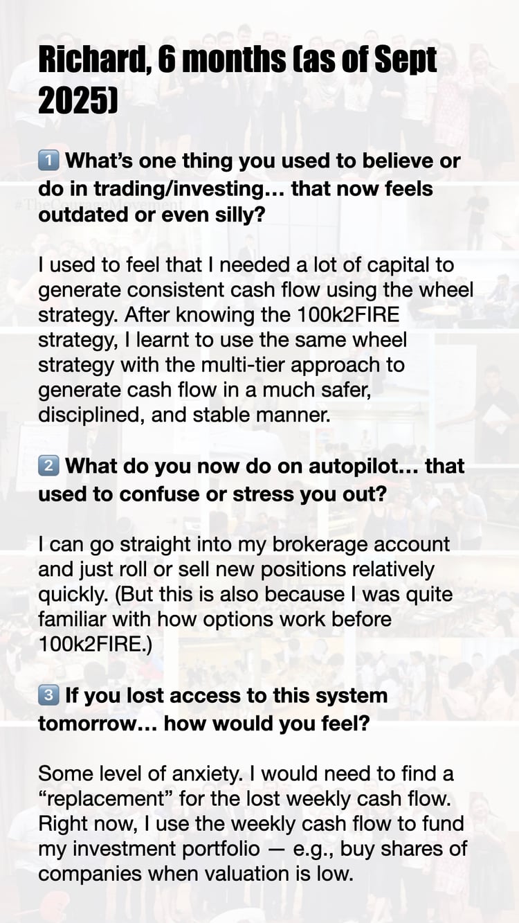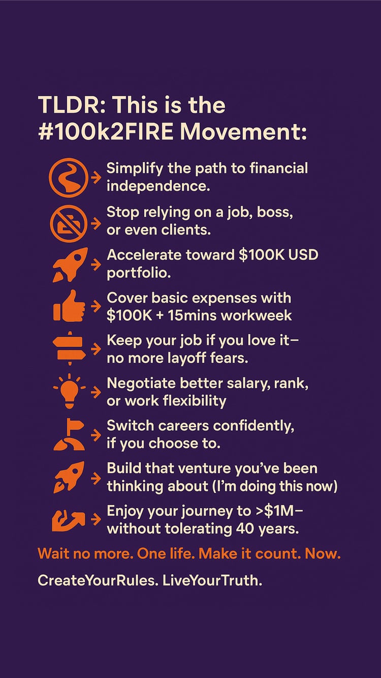 The 100K2FIRE program involves leveraged ETFs and options strategies, which carry inherent risk and volatility. You may lose part or all of your investment. I provide a structured framework for risk management. Market outcomes remain uncertain and suitability depends on your individual circumstances. This is an educational program and not licensed by the Monetary Authority of Singapore. By participating, you accept full responsibility for your financial decisions. Seek independent professional advice if necessary.