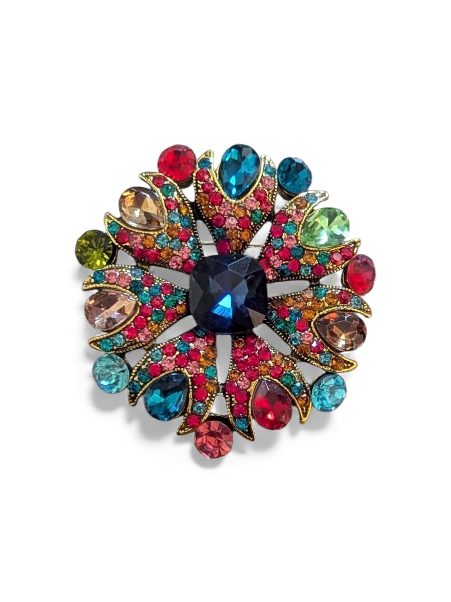Bursting with color and sparkle, this show-stopping brooch is a true work of art! Featuring a large deep sapphire-blue centerpiece surrounded by an explosion of multicolored rhinestones in rich jewel tones — ruby red, aqua, amber, emerald, and fuchsia — each stone catches the light beautifully for a dazzling effect.