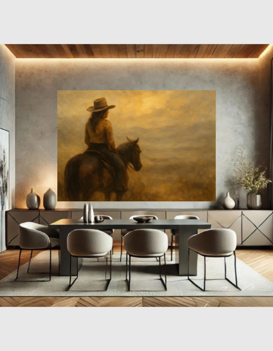 Imagine the soft glow of dusk wrapping around a fierce cowgirl on horse, her wide-brim hat tipped just so, evoking rodeo dreams and open prairies. This cowgirl print isn't just decor – it's a statement piece for horse lovers, western enthusiasts, and anyone craving that rustic wall art edge. Pair it with farmhouse decor accents like leather accents or woven baskets for a cohesive country girl gallery wall, or frame it solo in a pink cowgirl nursery for sweet, sassy inspiration.