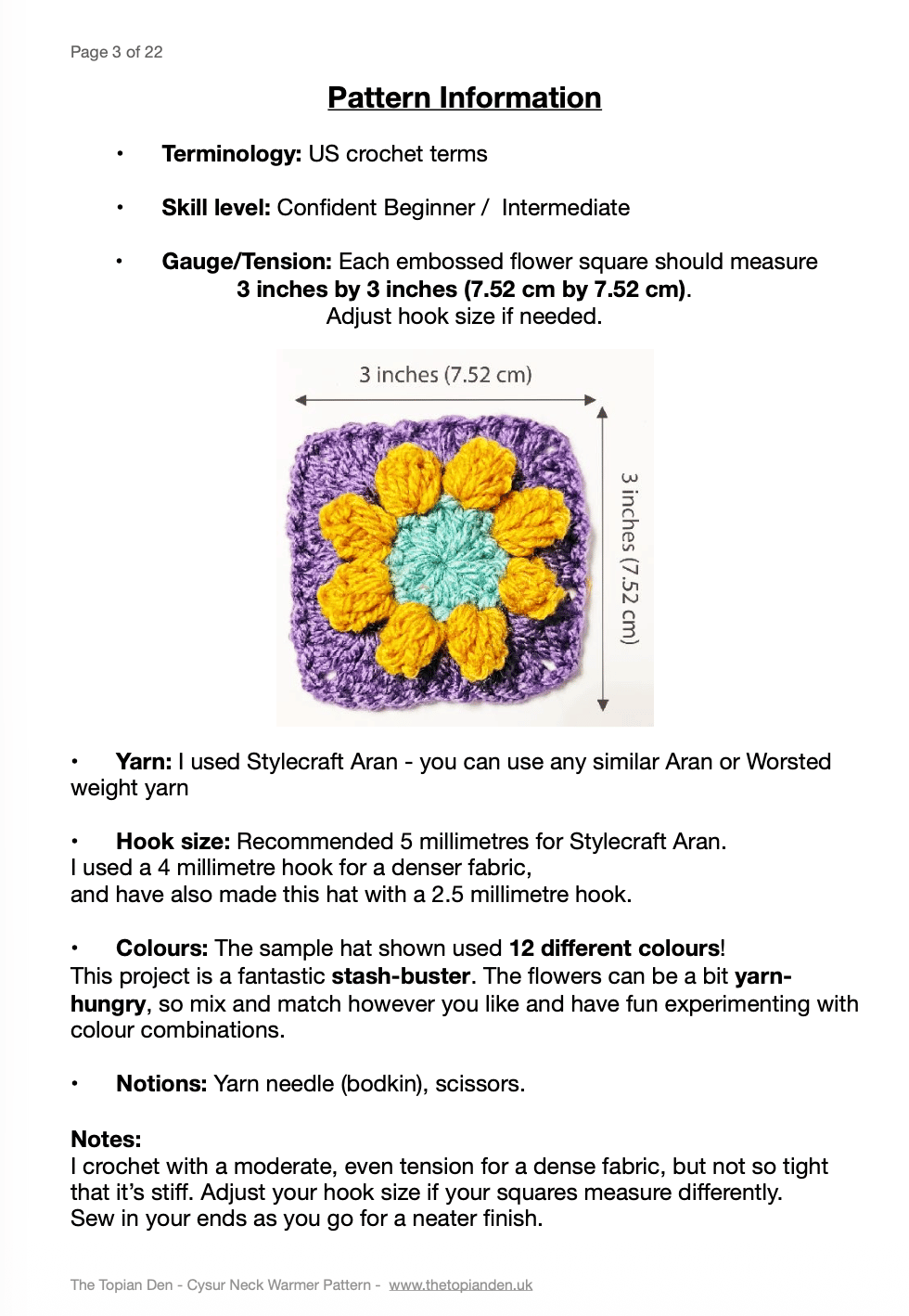 - Notes on tension, hook size, yarn type, and sizing