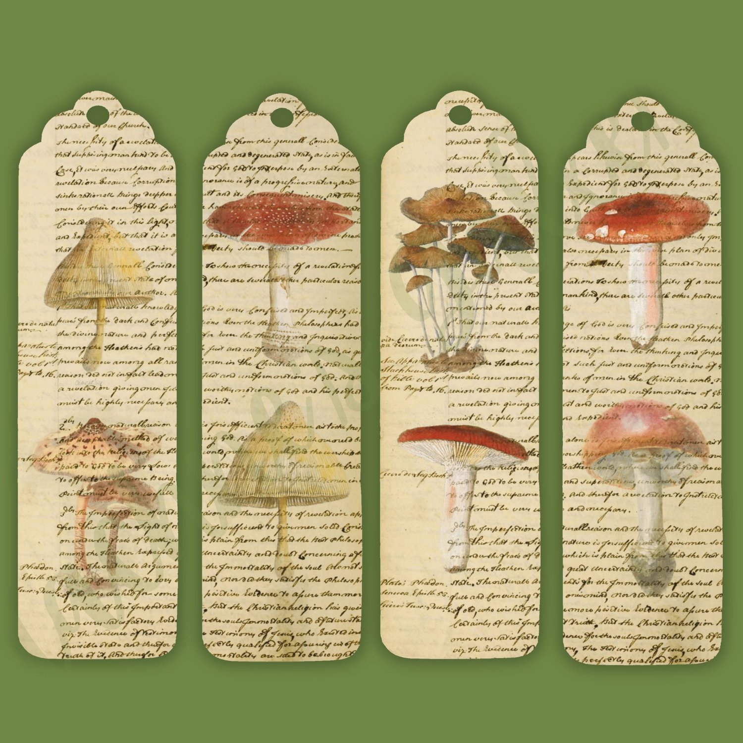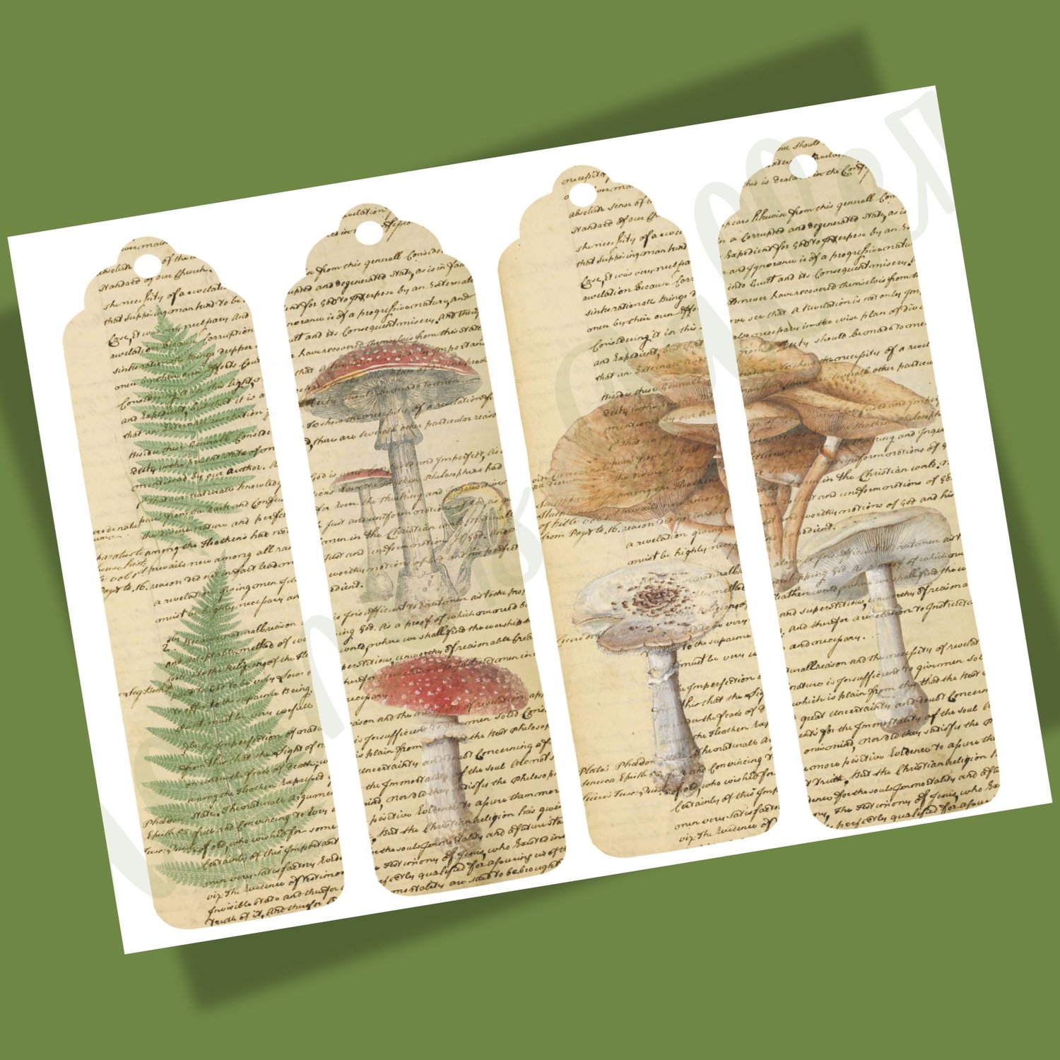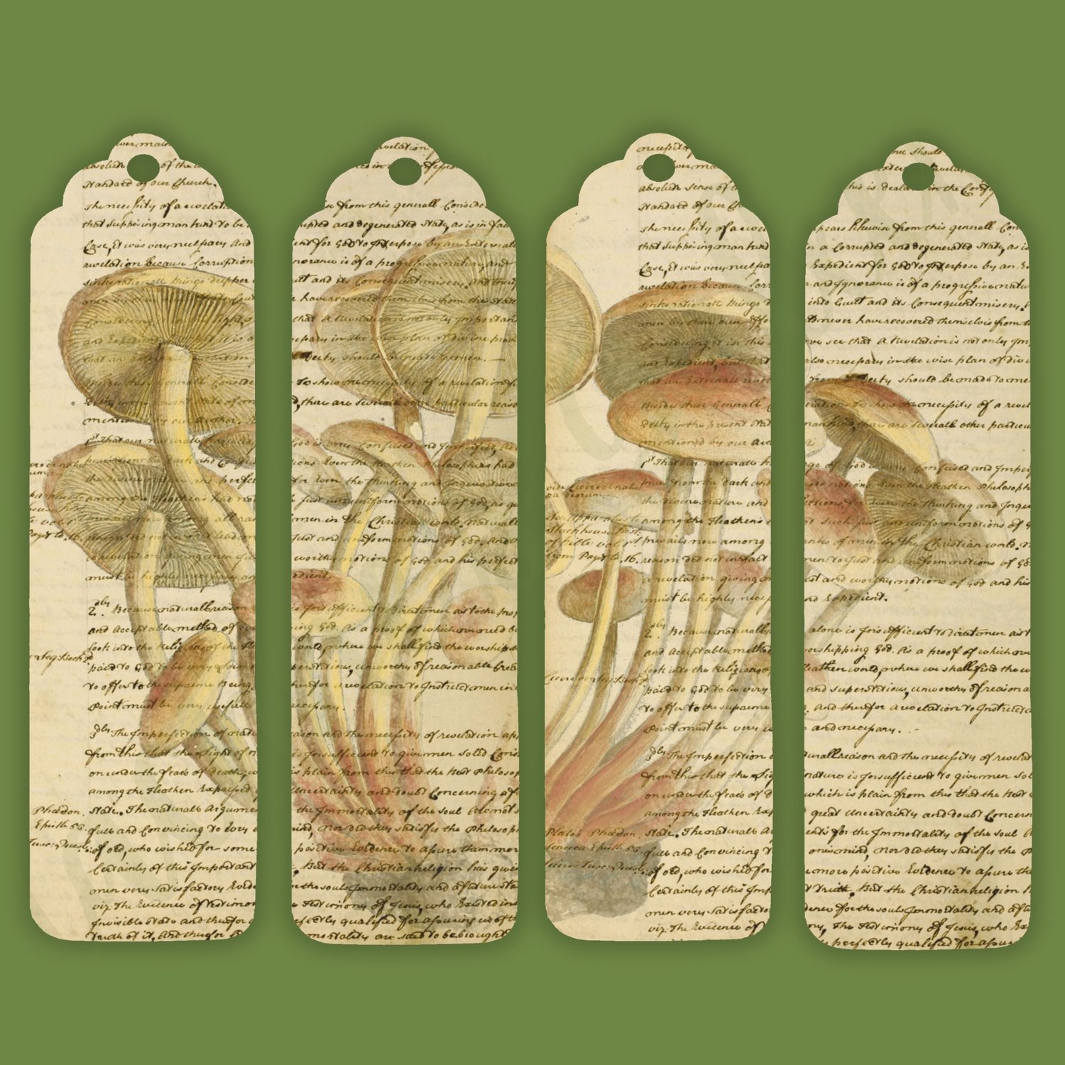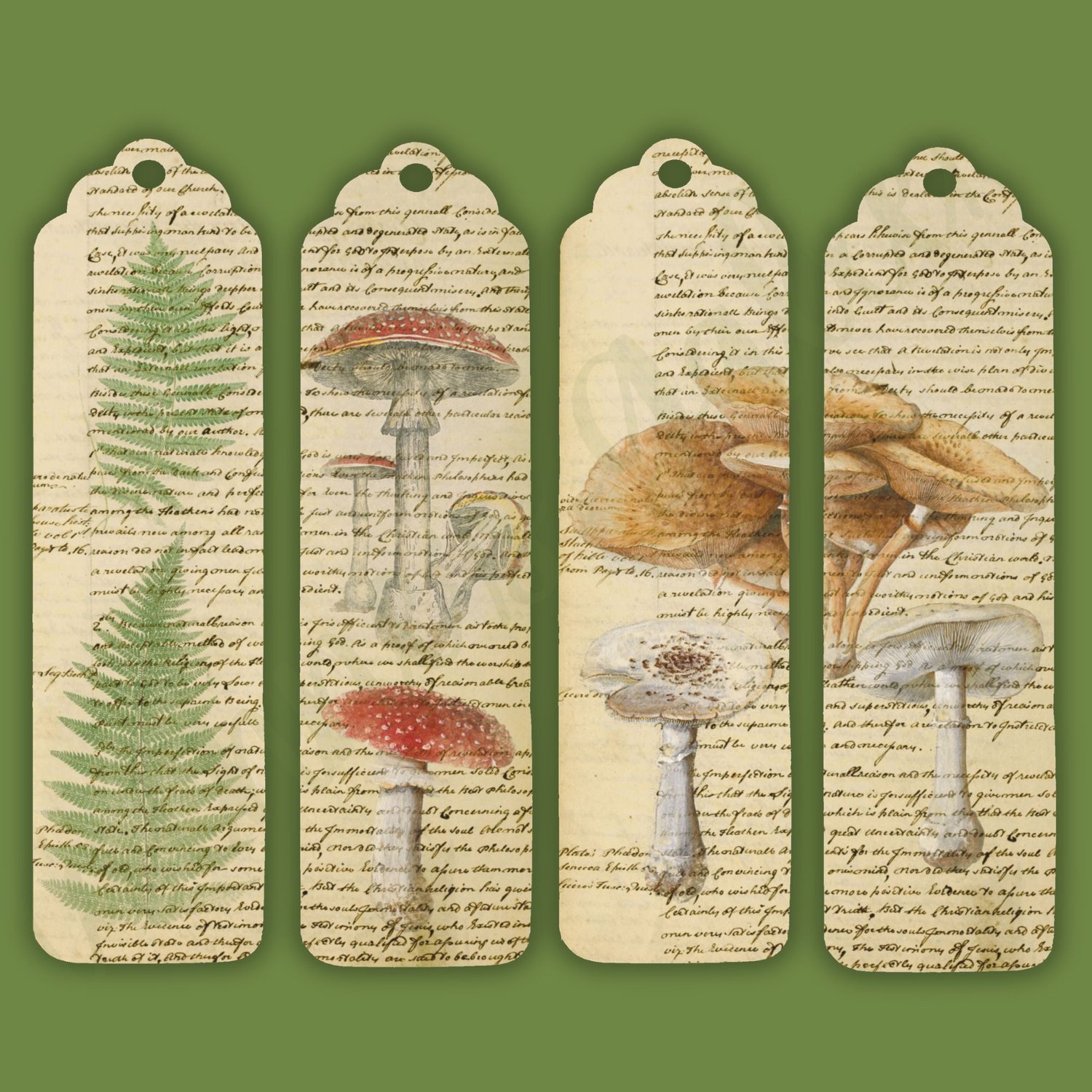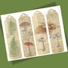 Bring the forest inside with this set of bookmarks! Detailed pictures of various mushrooms and ferns feature on a handwriting background.