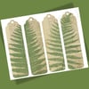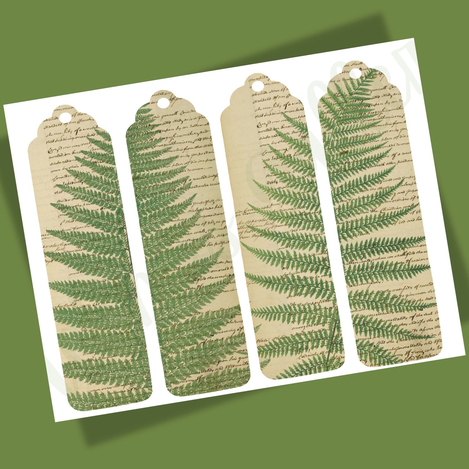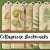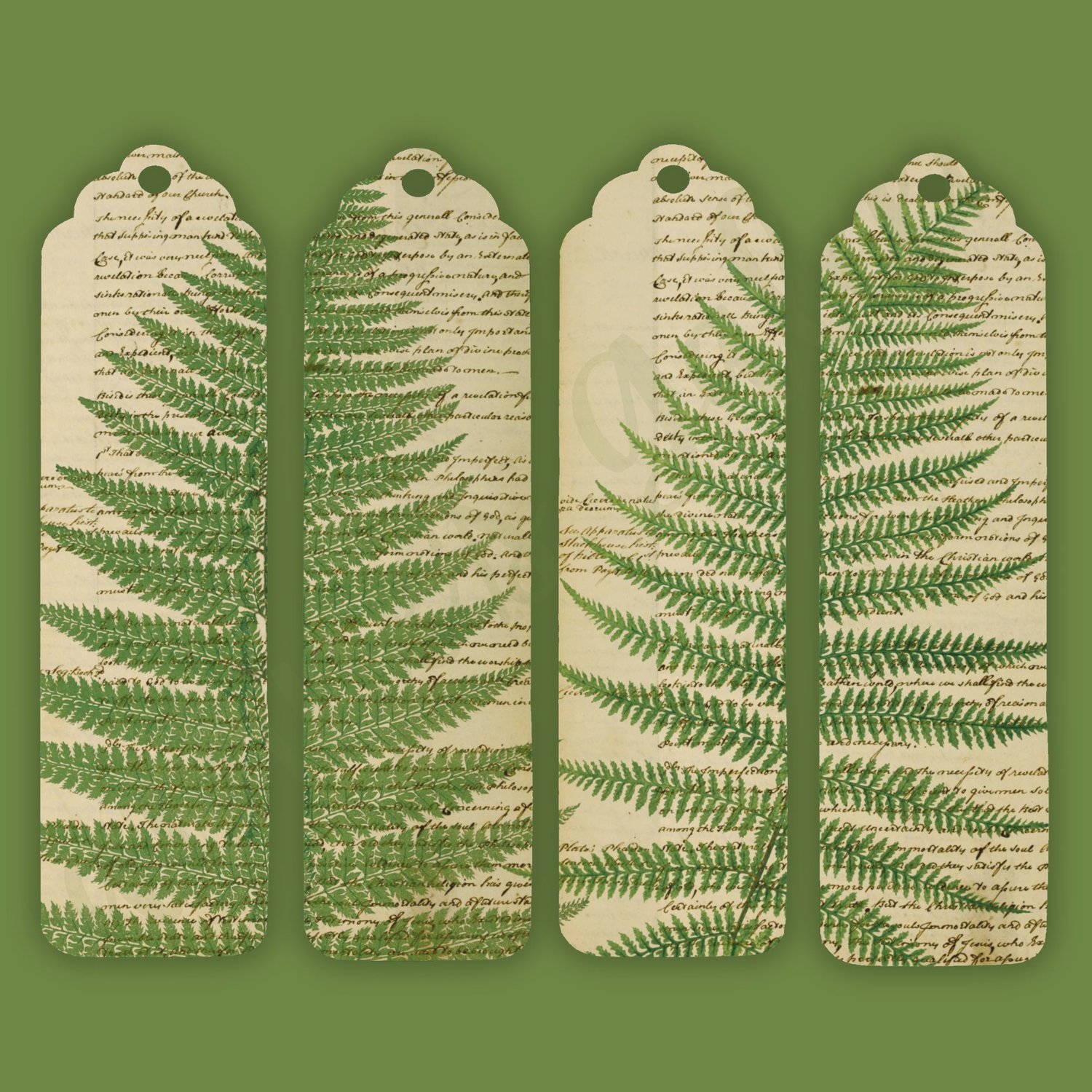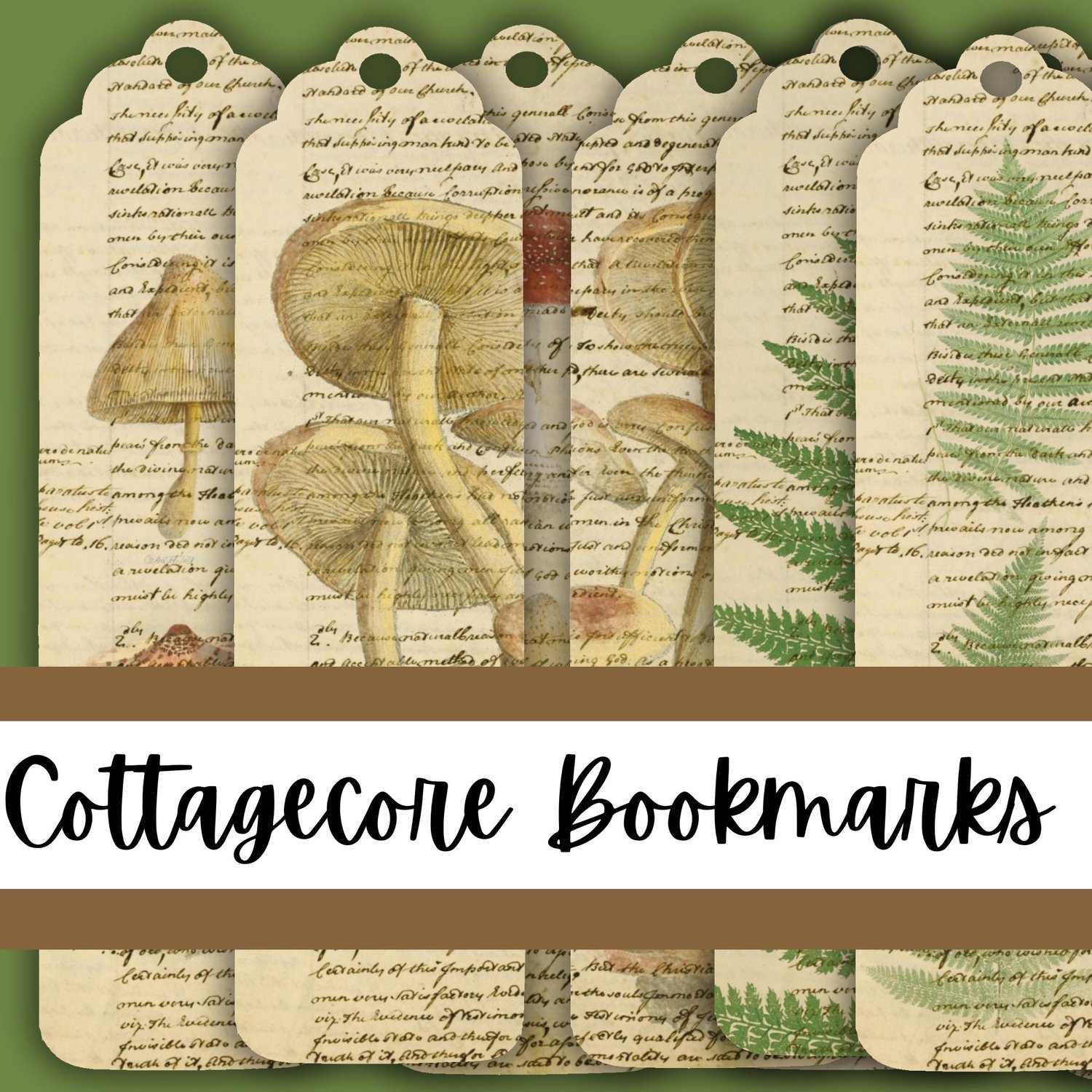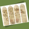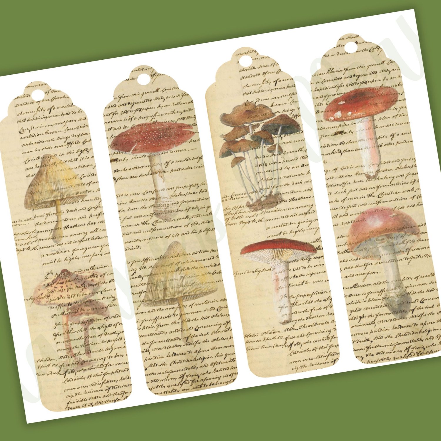 Bring the forest inside with this set of bookmarks! Detailed pictures of various mushrooms and ferns feature on a handwriting background.
