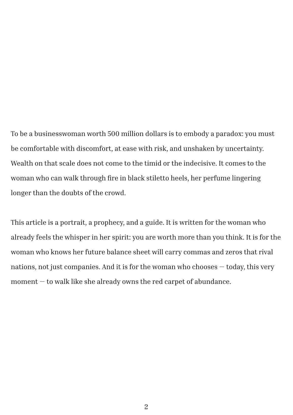 To be a businesswoman worth 500 million dollars is to embody a paradox: you must be comfortable with discomfort, at ease with risk, and unshaken by uncertainty. Wealth on that scale does not come to the timid or the indecisive. It comes to the woman who can walk through fire in black stiletto heels, her perfume lingering longer than the doubts of the crowd.