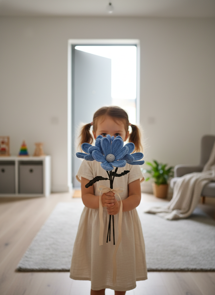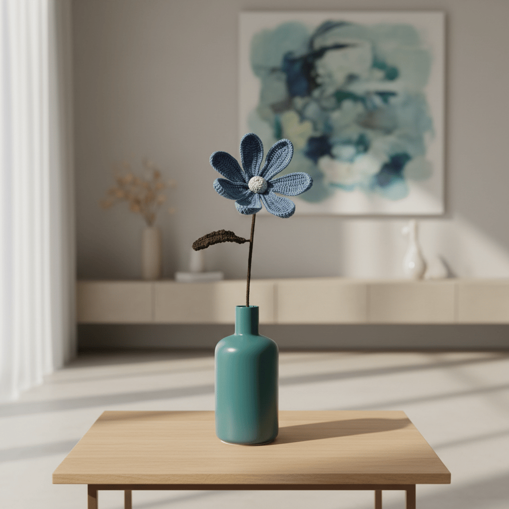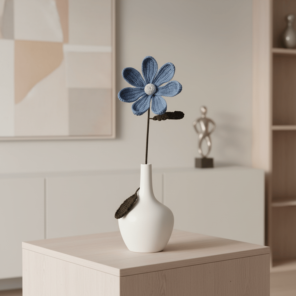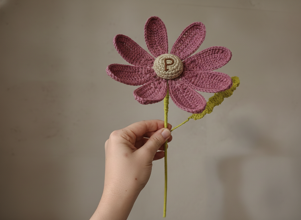 This Crochet Daisy pattern is soft in texture yet bold in size, is designed to stand out, whether styled on its own, added to a bouquet, or gifted to someone special. This big crochet daisy lets you add a hand-embroidered initial to the flower center, turning a beautiful crochet flower into a meaningful, one of a kind personalized gift.