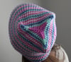 Worked in basic brioche stitch until you get to the crown, this hat is a fun and quick knit that’s a great way to use a single skein of fingering weight yarn in your stash. The brioche stitch does fun things with a self-striping yarn, as in the sample, but looks great in any color or style of yarn. The crown decreases are a bit fiddly but not difficult, making this a great beginner brioche project when you’re ready to do a bit of shaping.